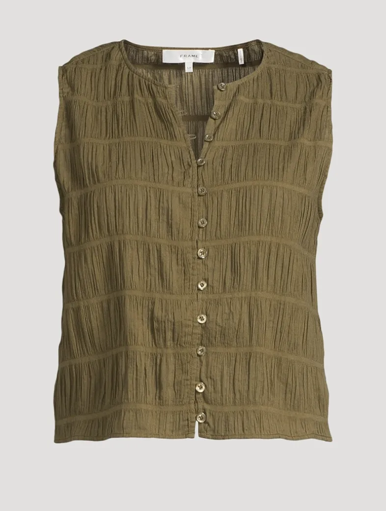 For a look that feels effortlessly, instantly pulled together, reach for this sleeveless top, made from crisp cotton fabric with a hint of stretch. It feels both easy and elevated thanks to a round collar, smocking, and a relaxed fit.