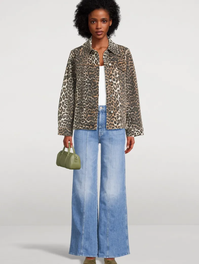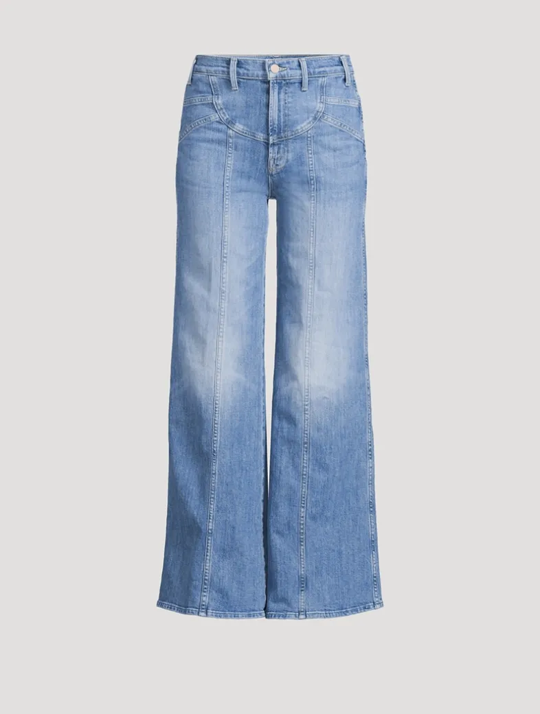 These ’70s-inspired wide-leg jeans are designed with a high rise, front seams, and a clean hem. Cut from stretch denim in mid wash with subtle whiskering and fading.