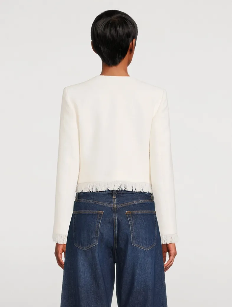 Crafted from a cotton-blend tweed, this timeless topper is cut to a boxy silhouette with a cropped length and padded shoulders. It is embellished with polished metal buttons and soft fringe trim.