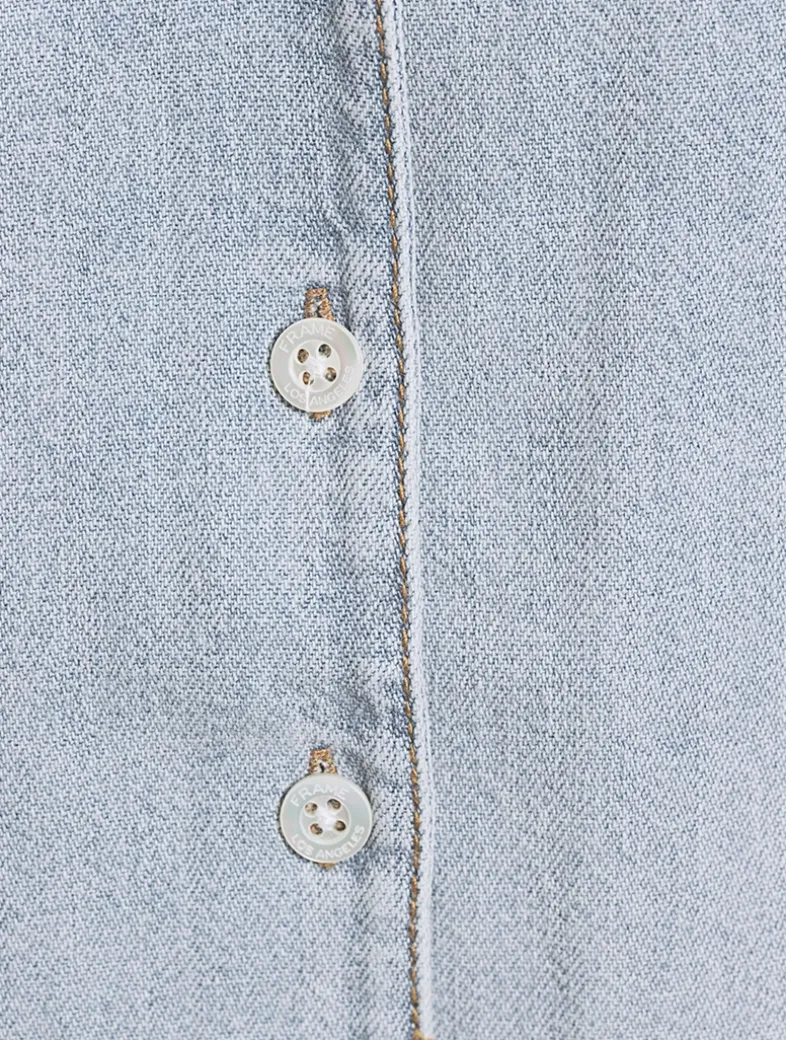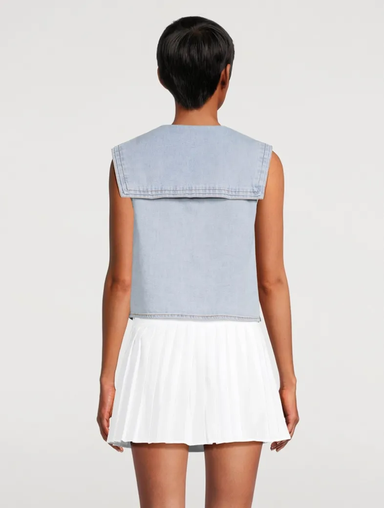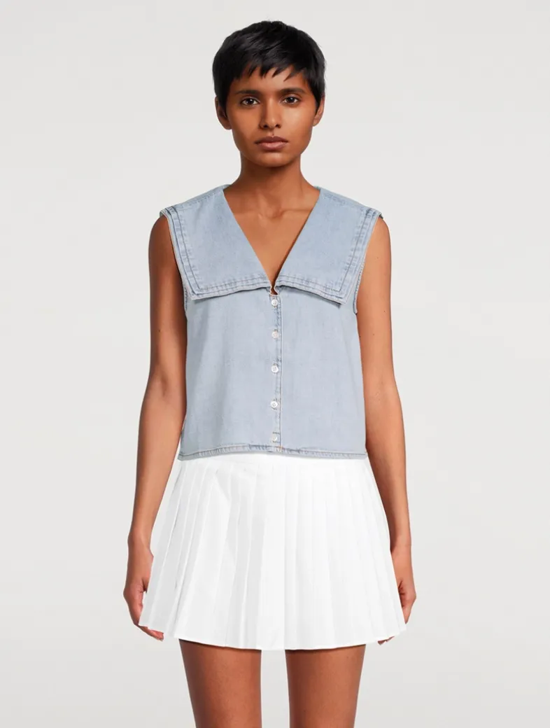 A sleeveless denim top with a wide sailor collar and a soft, sun-faded wash. Cropped to meet high-rise waistbands, it’s equal parts charming and relaxed.