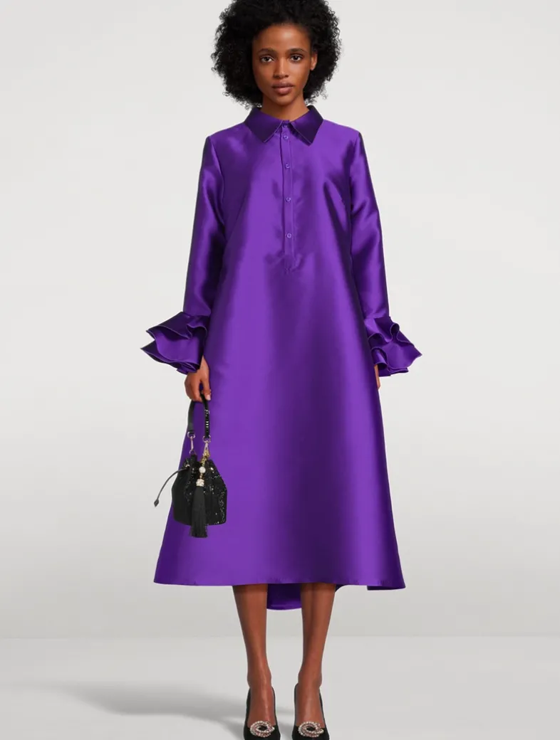 Made in Canada from a silk-blend satin, this midi mixes a luxurious fabrication with a sophisticated silhouette. A pointed collar and buttoned placket nod to shirting details, while tiers of ruffles at the cuffs and a glossy sheen give the dress a dramatic feel.