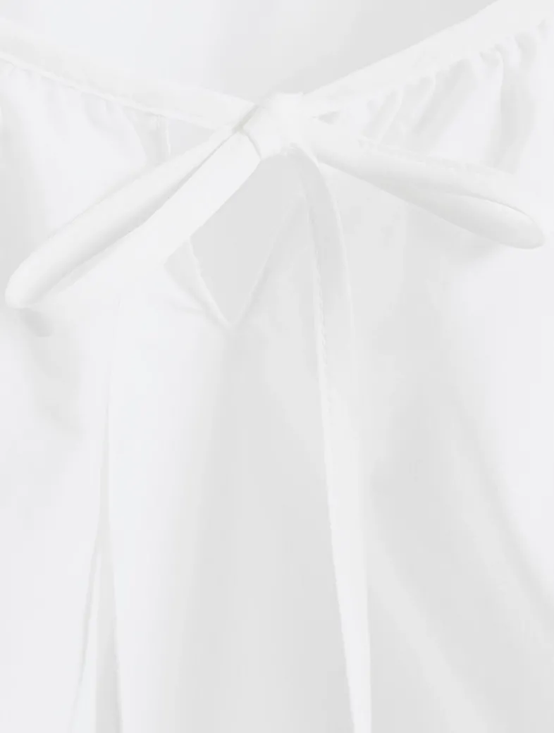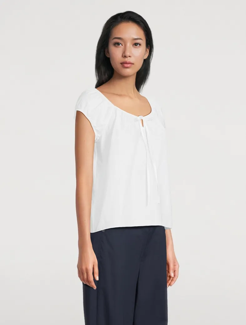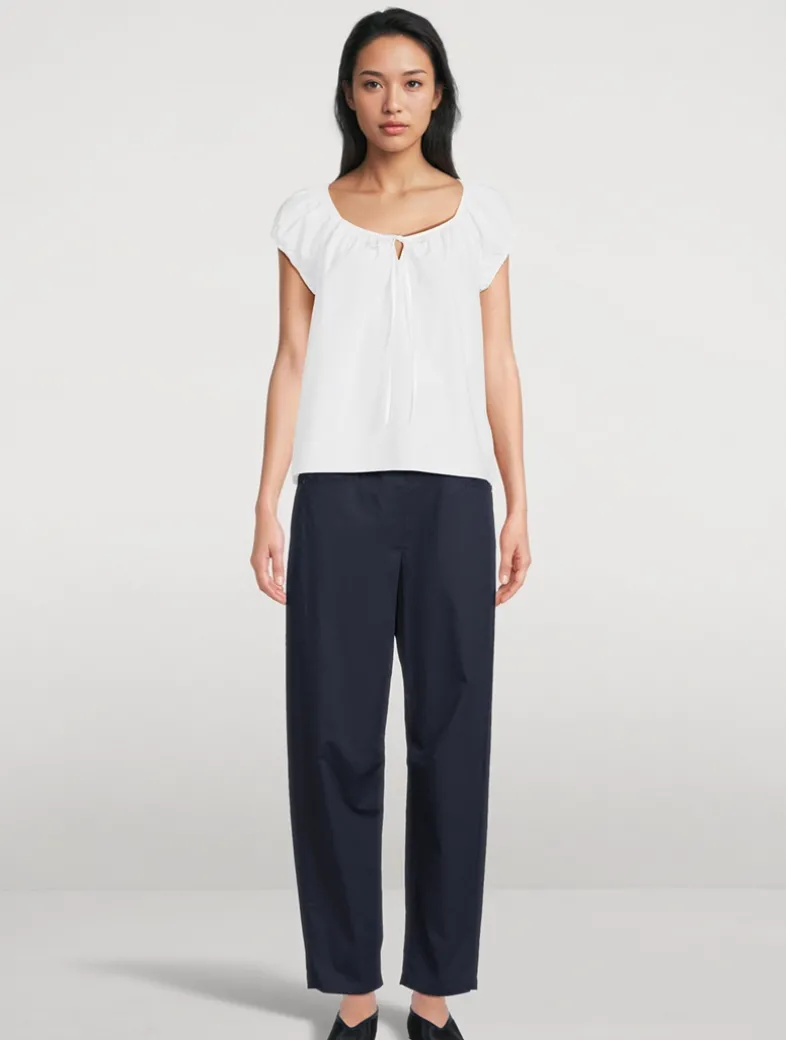 This lightweight blouse offers a comfortable, oversized fit with cap sleeves and tie accents at the scoop neckline. It’s crafted in a tumbled fabrication woven with a blend of cotton and recycled nylon by a leading Japanese mill.