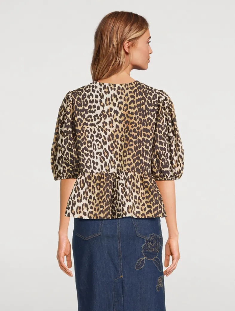 This leopard-printed peplum top is made from organic cotton. The blouse is designed for a relaxed fit and features an open round neckline with tie bands and short puff sleeves with elastic edges.