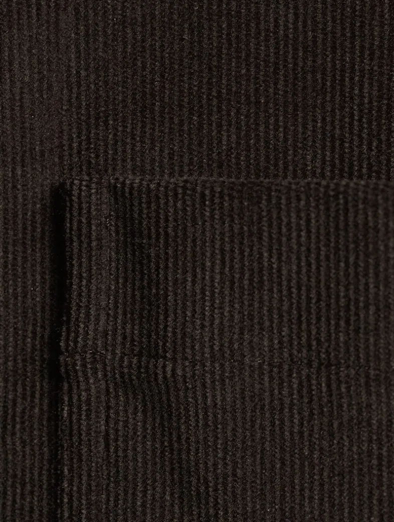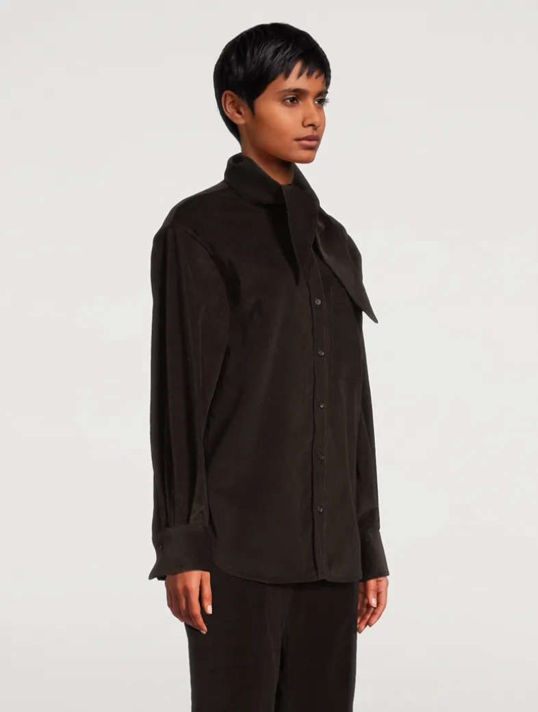 This shirt is cut from sumptuous corduroy with a soft and warm feel. A kerchief collar adds a unique twist to this button-up with utility pockets and an asymmetrical rounded hem.