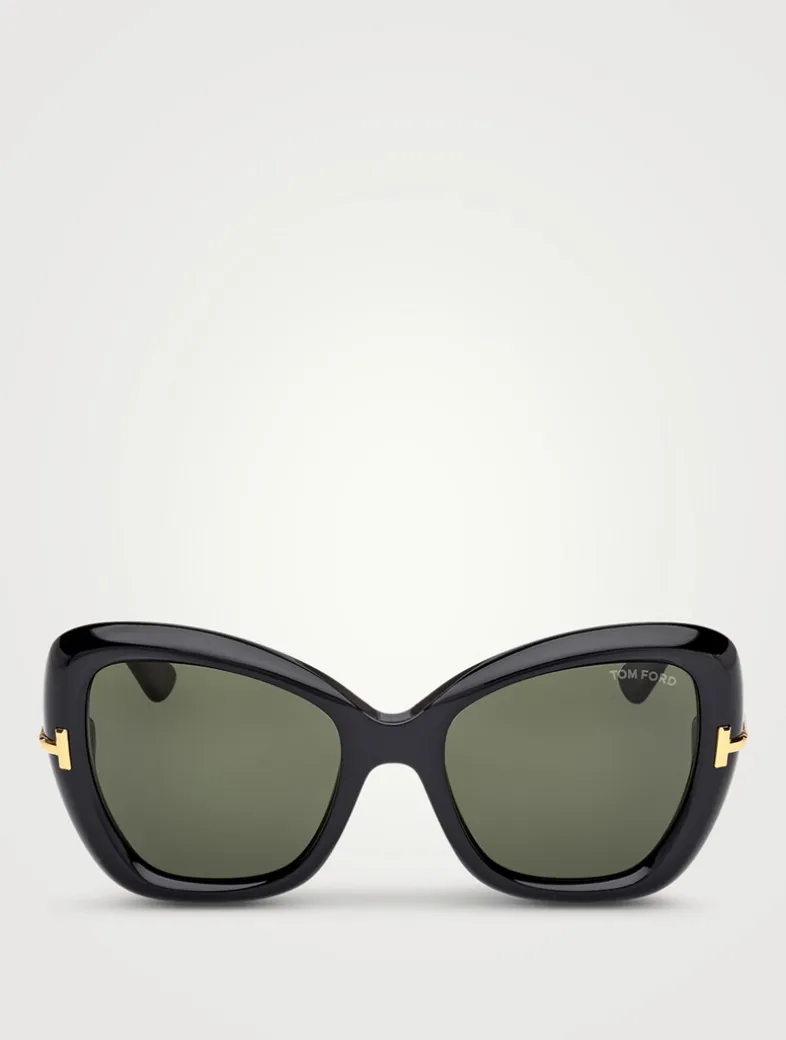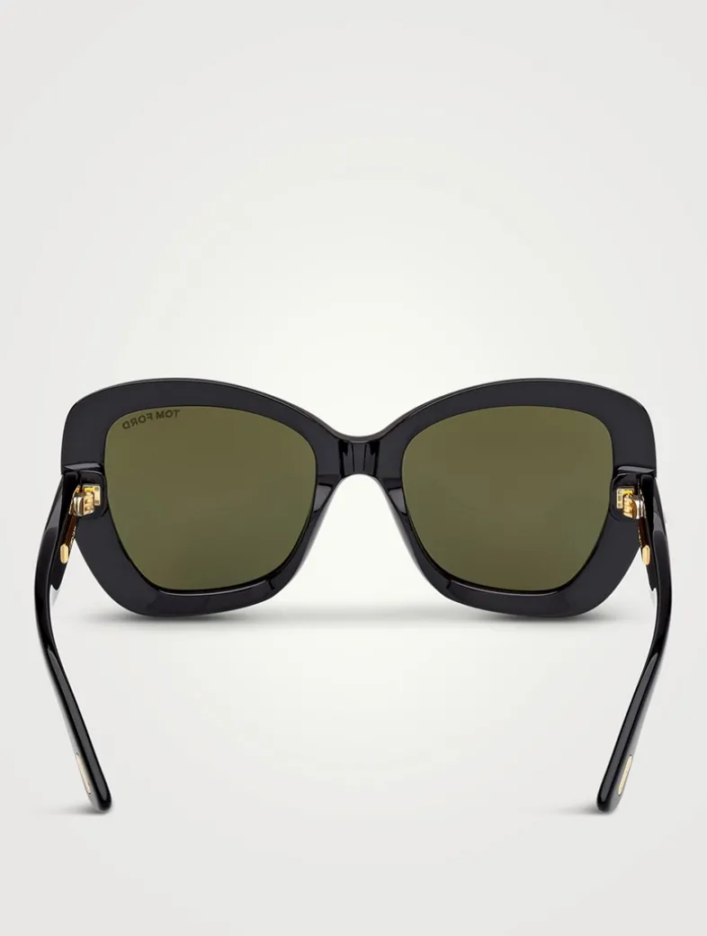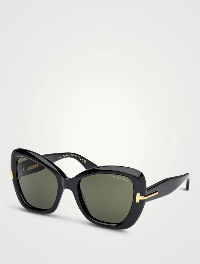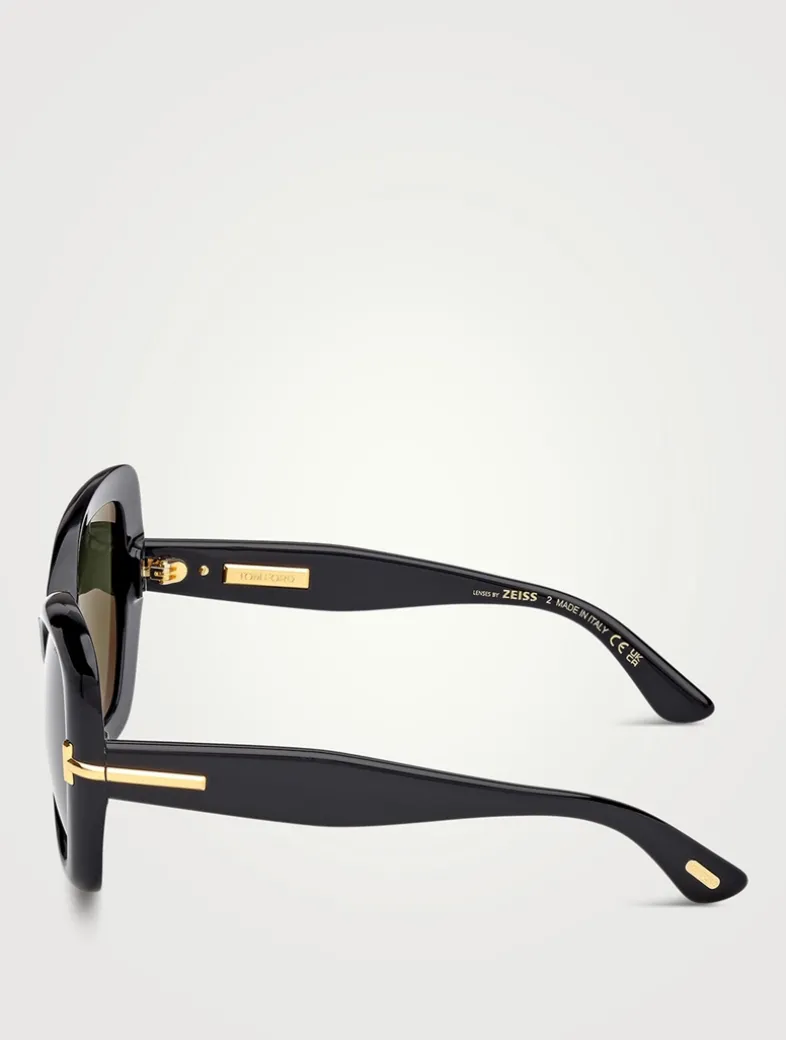 Bold and sophisticated, this feminine butterfly-style sunglasses feature magnified proportions, chunky acetate, beveled edges, a diamond-cut tridimensional T logo, a gold Tom Ford plaque on the inner temple, and premium ZEISS lenses with UV protection.