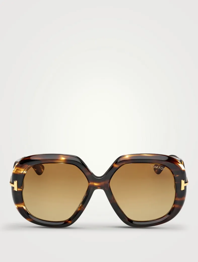 These oversized, 70s-inspired sunglasses feature a tridimensional diamond-cut T logo and a gold Tom Ford signature plaque on the inner temple, combining sculptural design with ZEISS lenses for superior clarity and UV protection. Made in Italy to the highest artisanal standards.