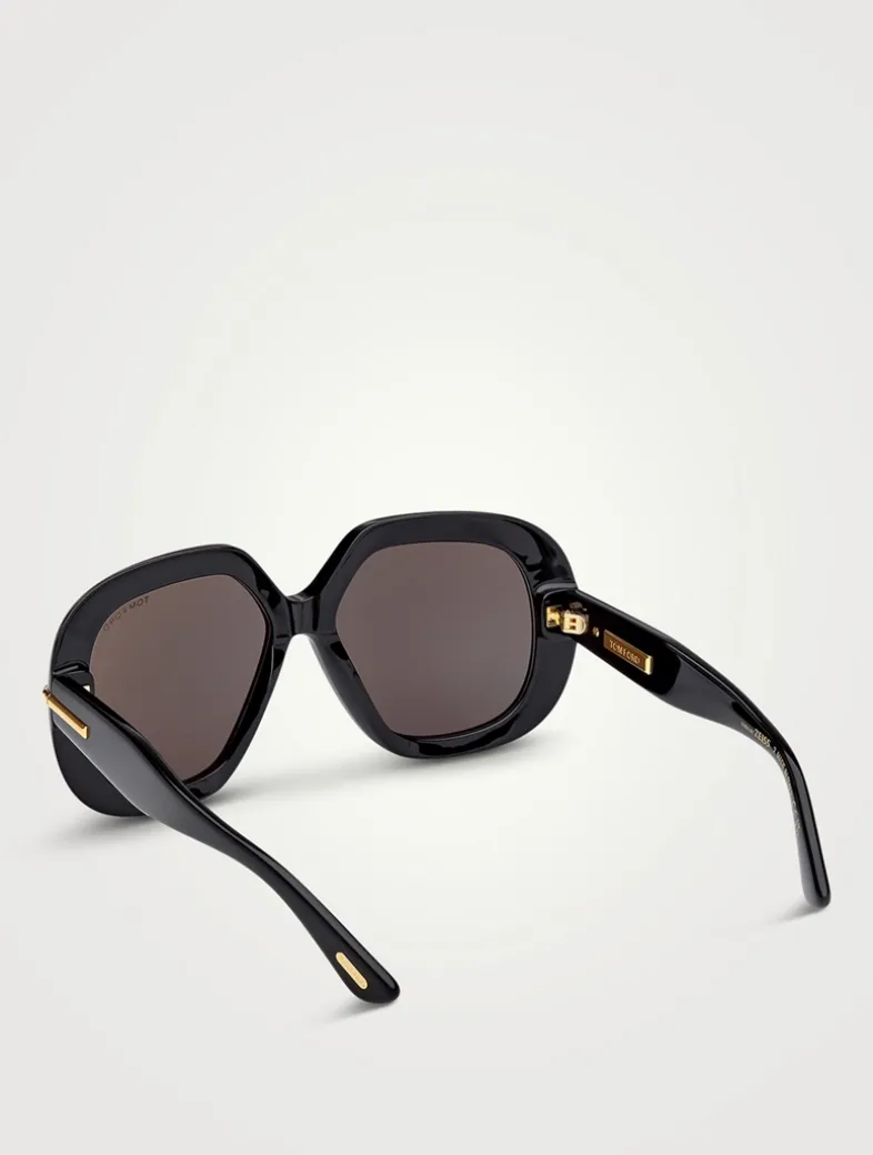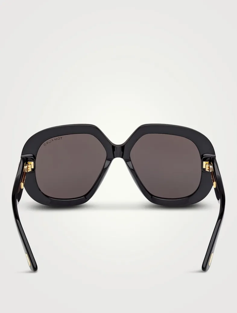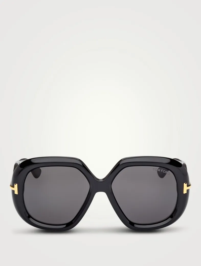These oversized, 70s-inspired sunglasses feature a tridimensional diamond-cut T logo and a gold Tom Ford signature plaque on the inner temple, combining sculptural design with ZEISS lenses for superior clarity and UV protection. Made in Italy to the highest artisanal standards.