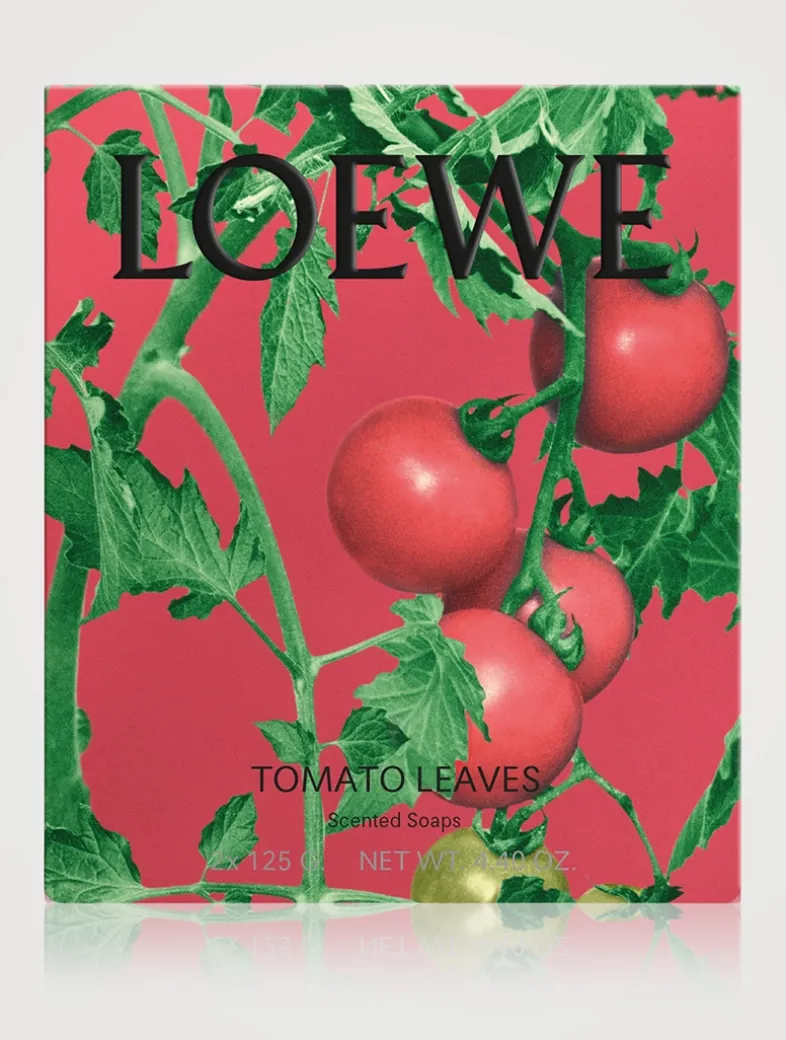 A pair of cleansing bars featuring the LOEWE Home Scents Tomato Leaves fragrance—a fresh and green scent that evokes the fresh, verdant aroma of the vines just before they burst into fruit. Inspired by the Ancient Greek and Roman practice of integrating therapeutic botanical essences in their bathing rituals, the soaps feature natural ingredients with skin-nourishing properties and actively hydrating elements including shea butter—a deeply moisturizing and soothing element.