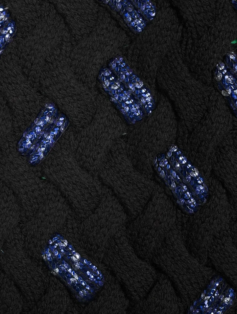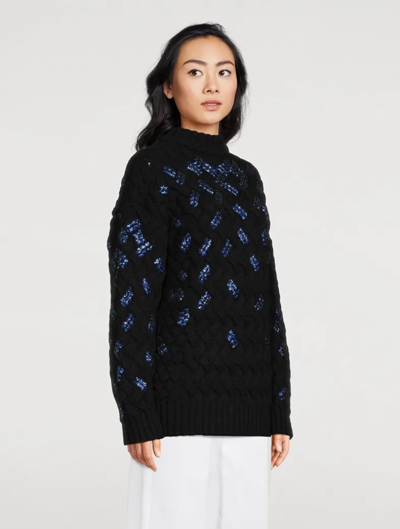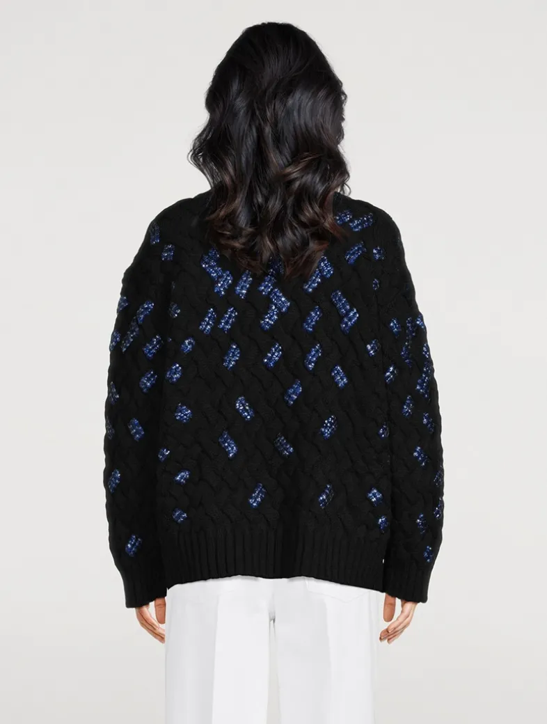 This pullover is knit from wool and woven in a faux crosshatch pattern embellished with dazzling beaded embroidery, lending a hint of sparkle to the piece. It has a slouchy silhouette with a crew neckline and dropped shoulders.