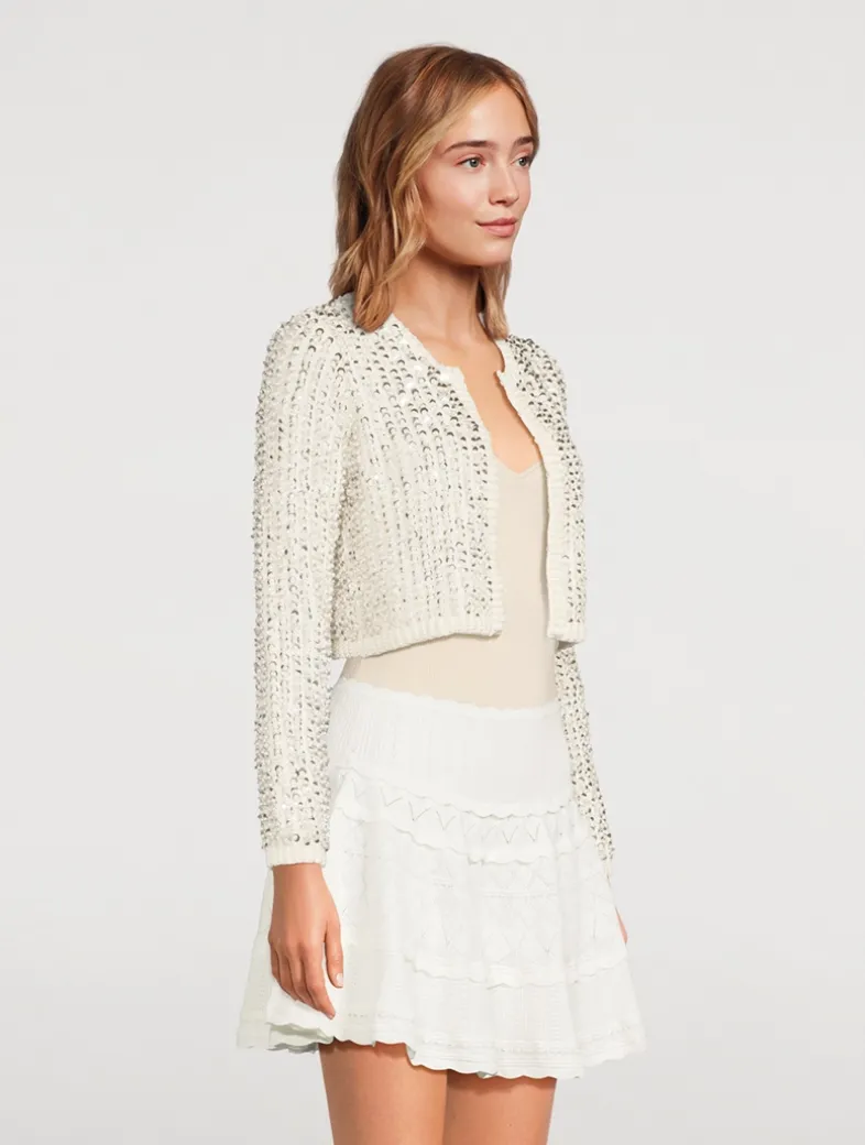 This luxurious and iridescent knit stuns and shimmers with thoughtfully placed pearls and sequins all over. Elevate any outfit with this cropped sweater.