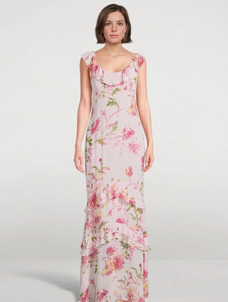 Fluttering ruffles highlight the neckline and skirt of this maxi dress. It is printed with a lovely floral motif and cut to a curve-skimming silhouette. Certified to the FSC standards (FSC 100%, FSC Mix, or FSC Recycled).