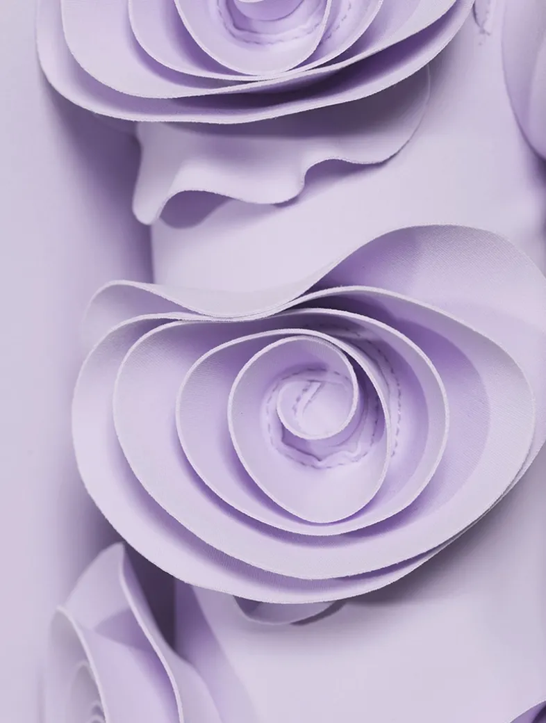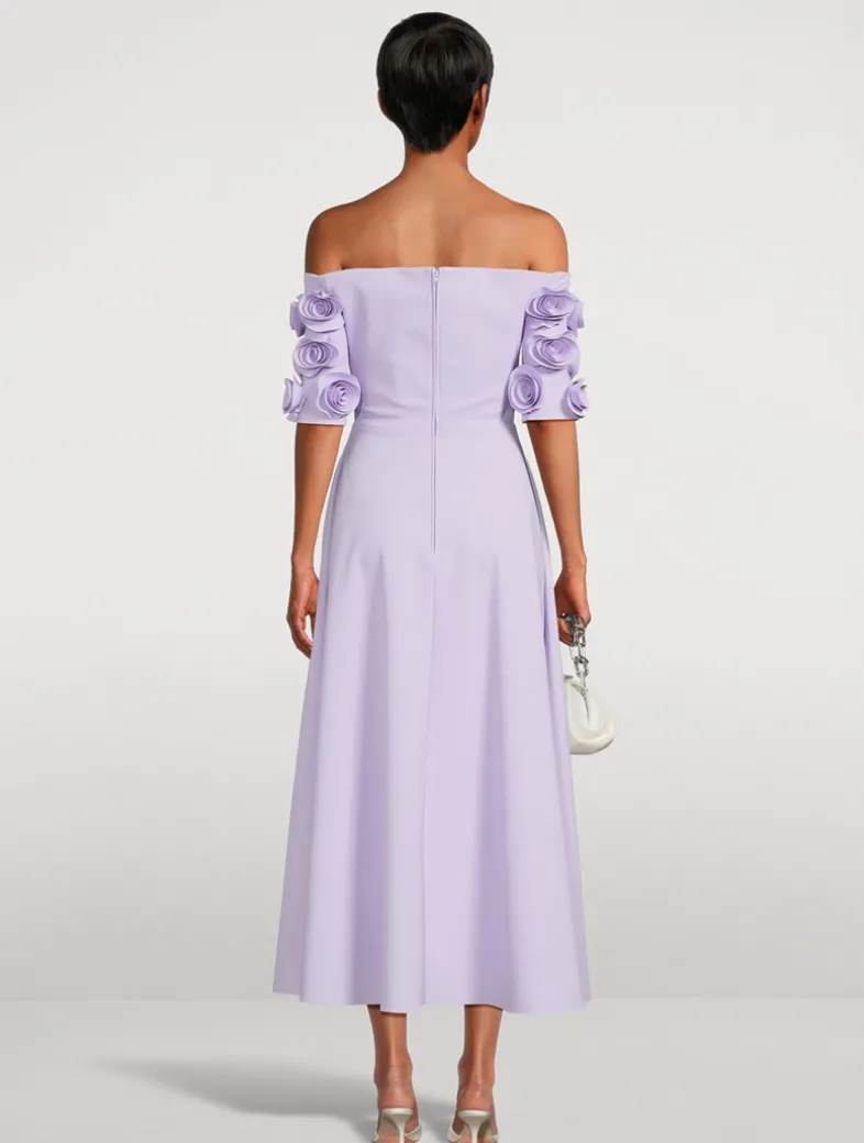 Romantic details define this made-in-Canada cocktail dress. Its tailored off-the-shoulder bodice has a dramatic curve at the front and rosette-embellished sleeves. A flared skirt falls to a mid-calf hem.
