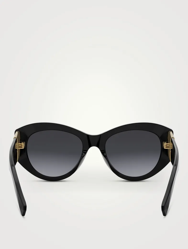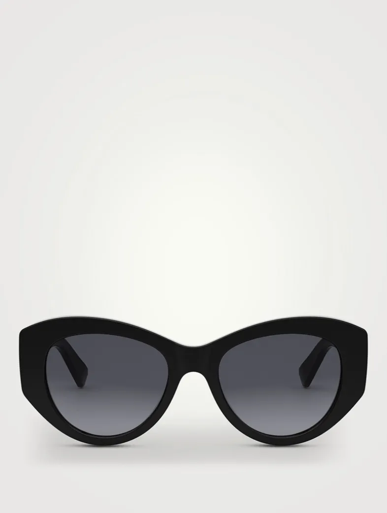 These sleek and slightly oversized cat-eye sunglasses showcase the Maison’s signature Bvlgari Tubogas design at the temples.