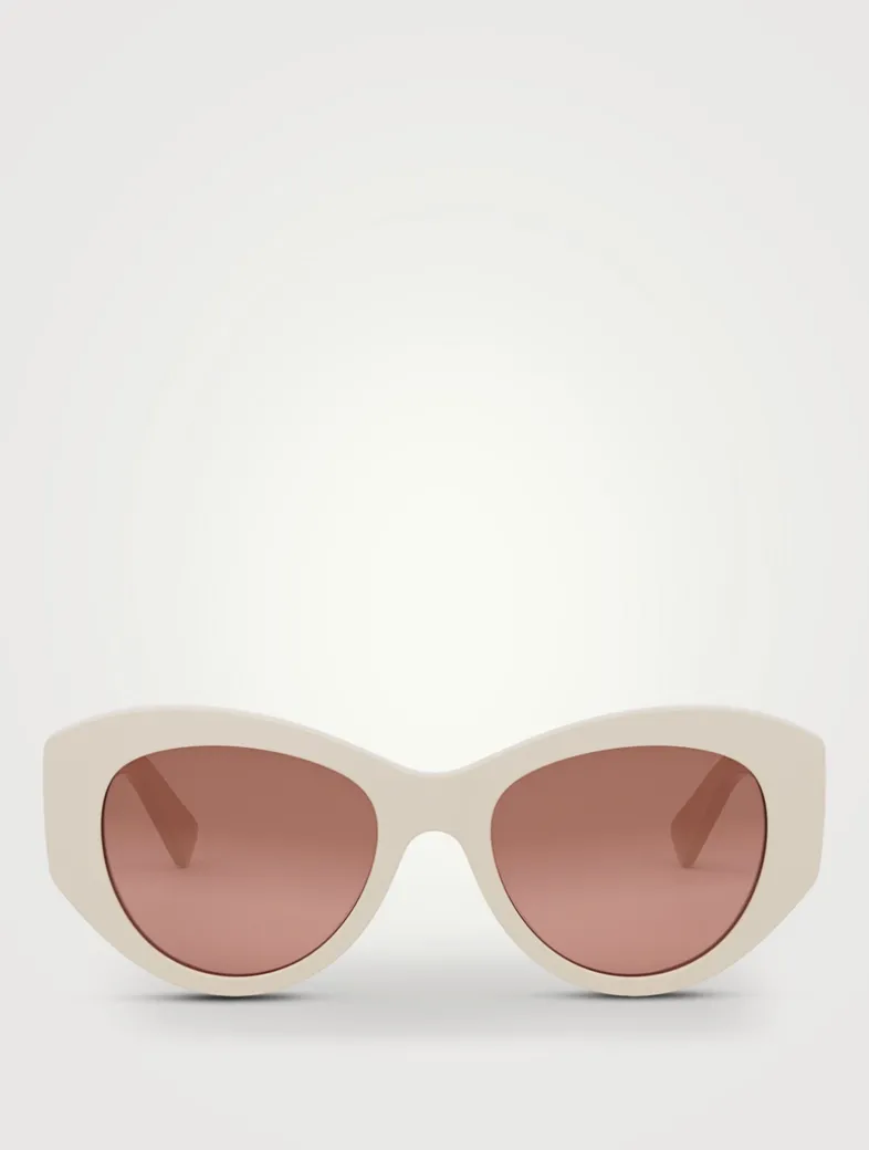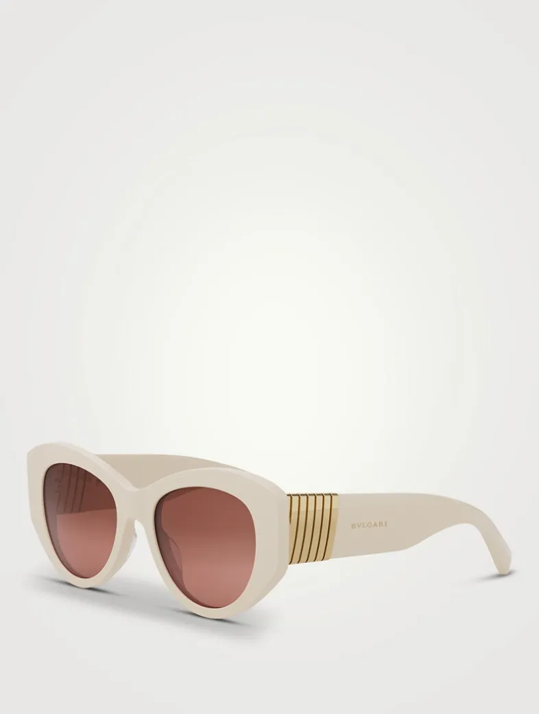 These sleek and slightly oversized cat-eye sunglasses showcase the Maison’s signature Bvlgari Tubogas design at the temples.