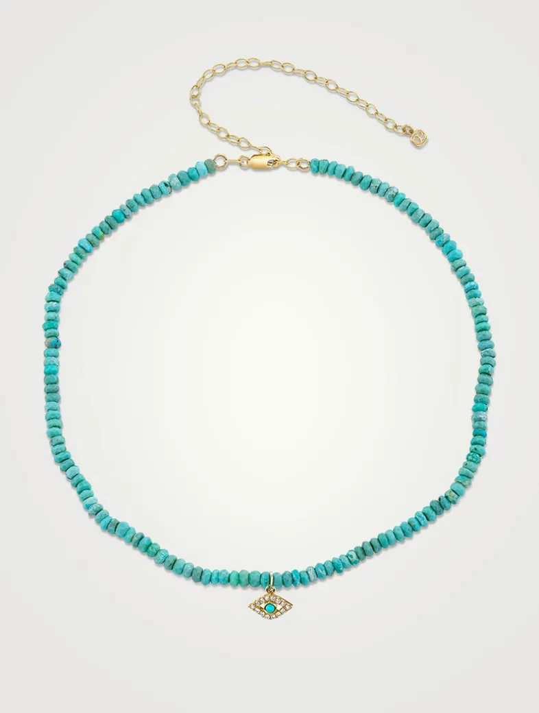 Strung with turquoise beads, this adjustable necklace is accented with a 14k gold evil eye charm, framed with diamonds and centred with bezel-set turquoise.