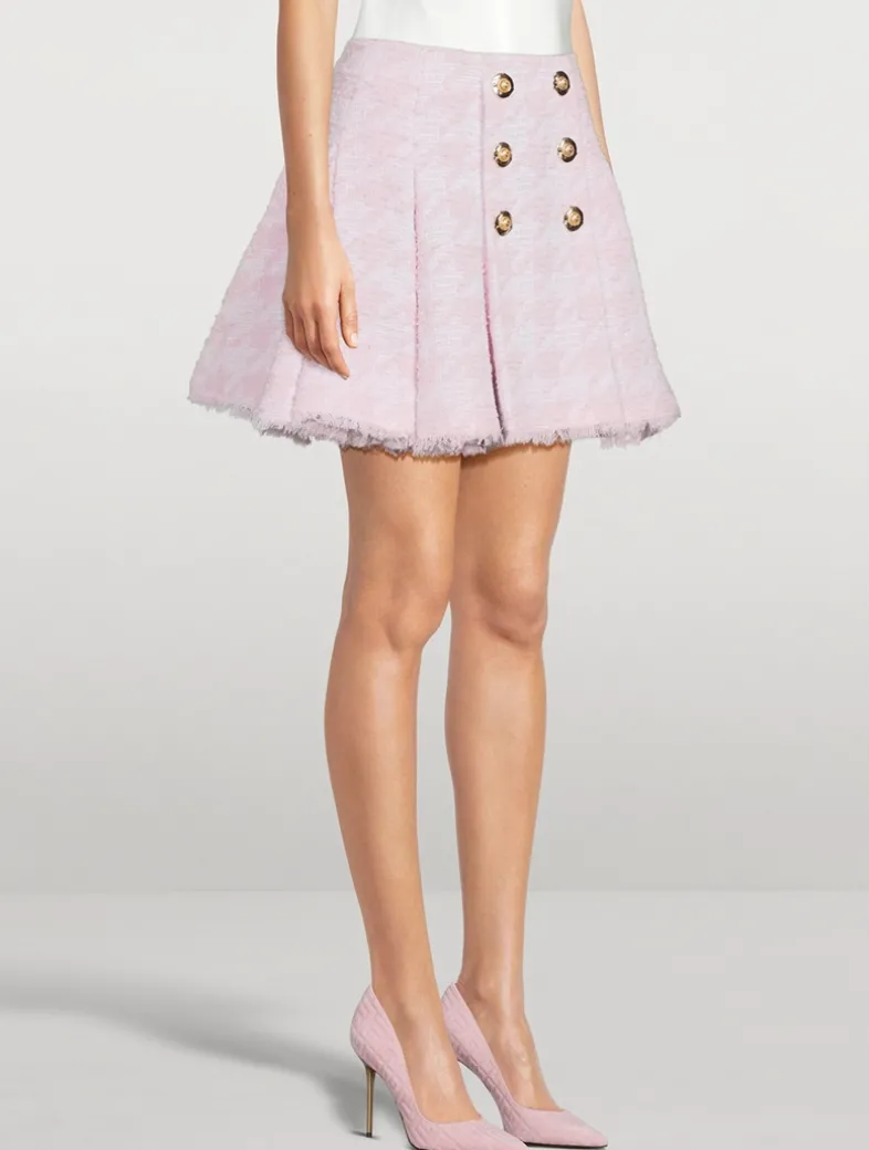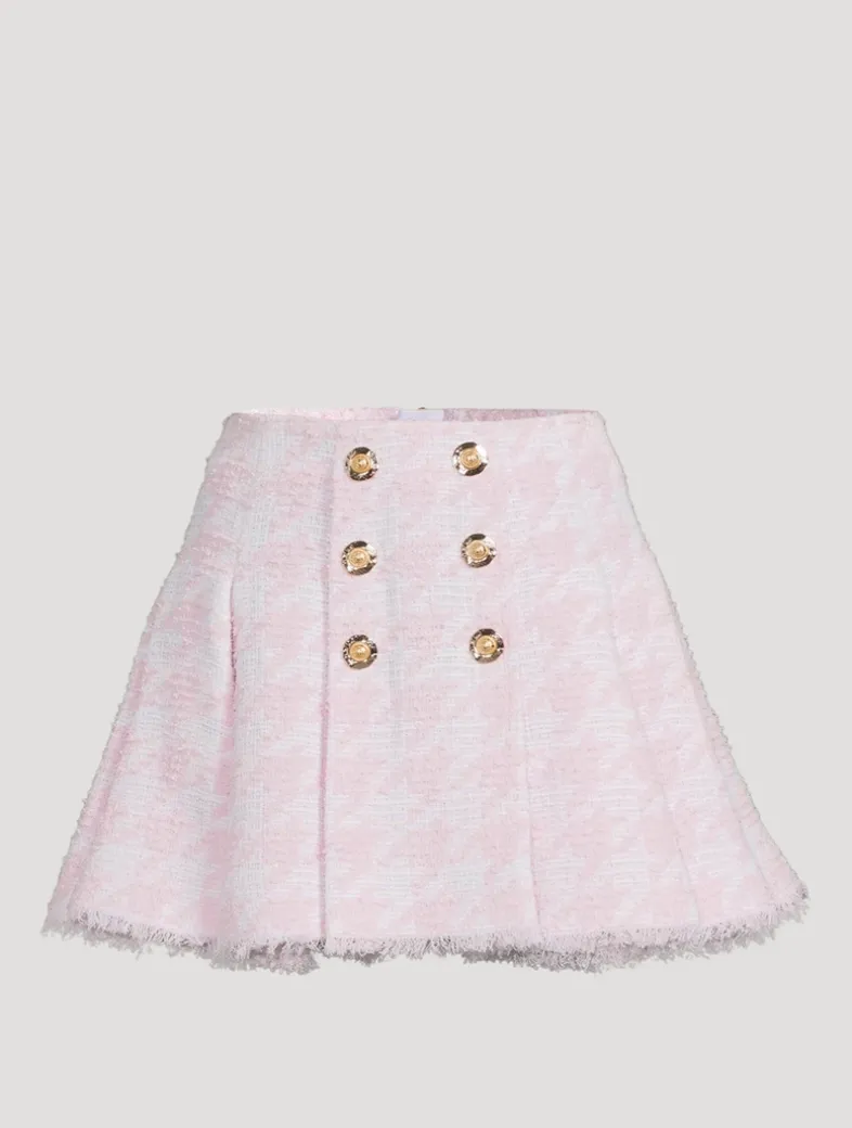 Crafted in a textured cotton-blend tweed, this mini skirt has a wrap design embellished with embossed gold-tone buttons at the front. It is finished with an exposed back zipper and cut in a flared silhouette.