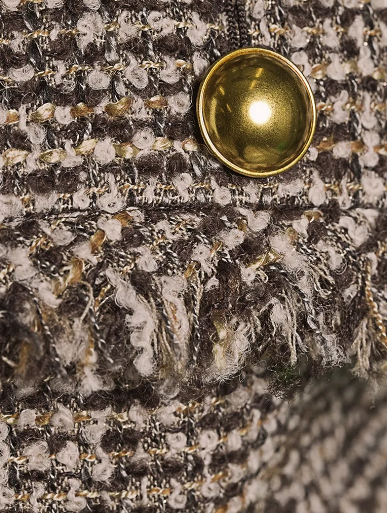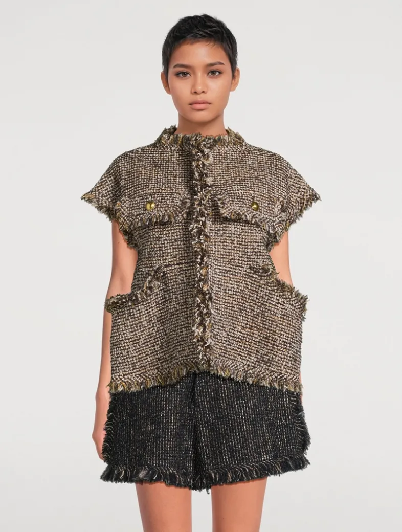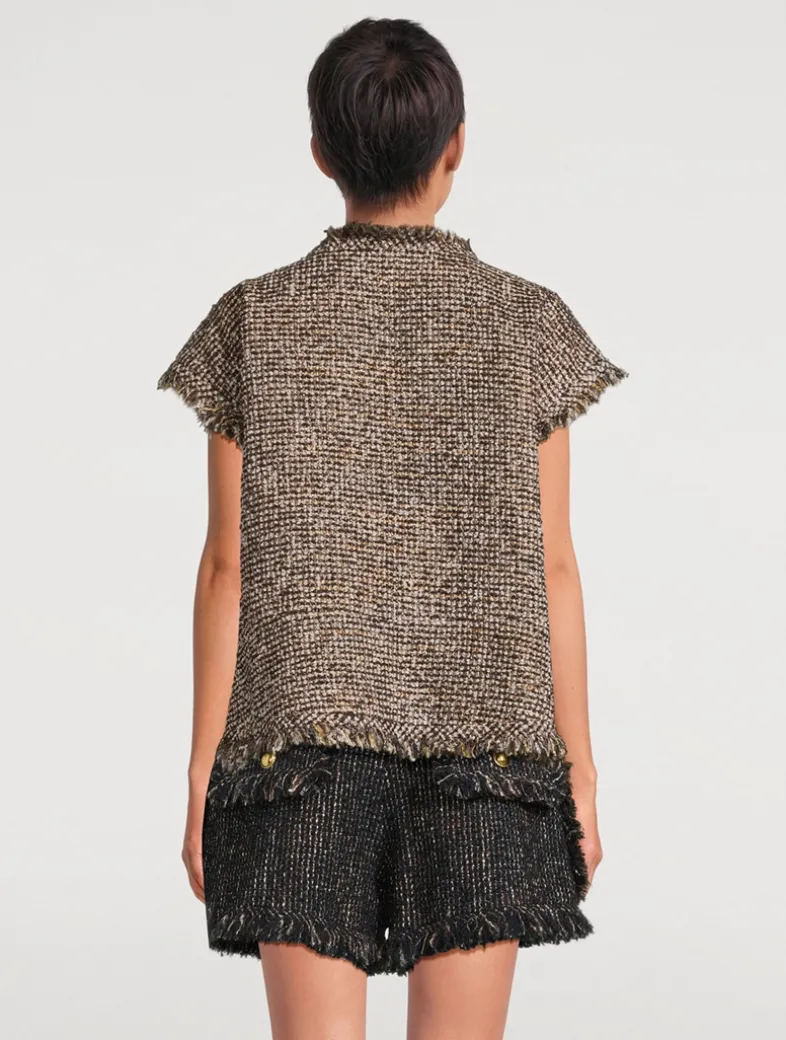 A statement-making layering piece, this boxy-fit topper is crafted from a wool-blend tweed with a textured finish and fringe trim. It has a collarless neckline and cap sleeves.