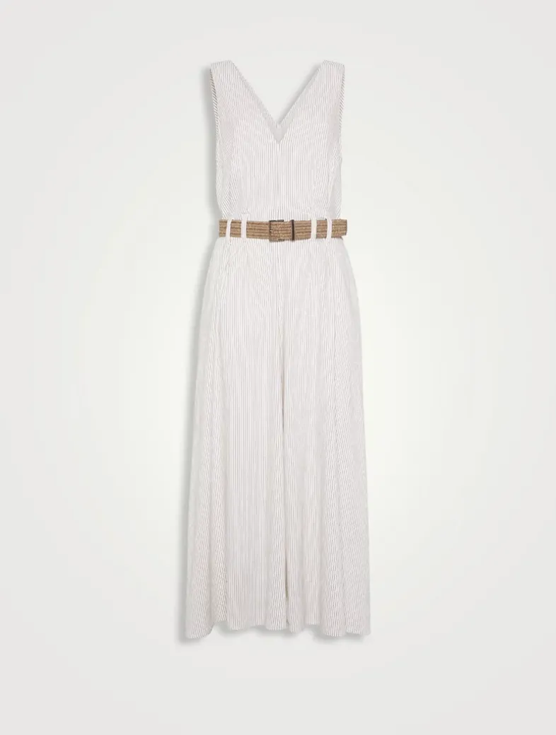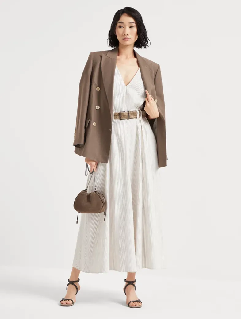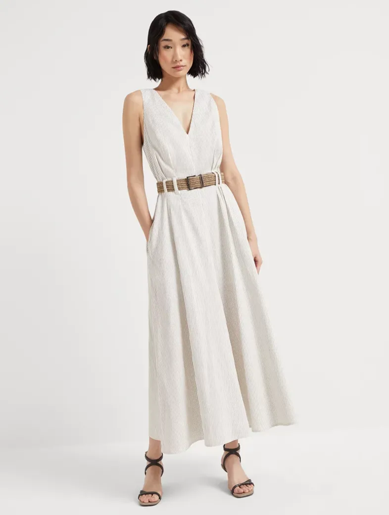 Comfort linen and cotton chalk stripe twill belted dress with monili