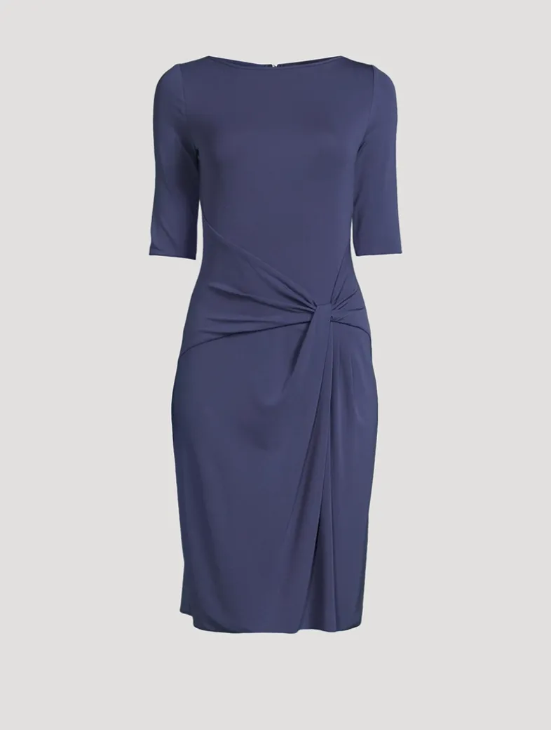 This refined dress is designed with a rounded neckline, embellished by a cross-over effect knot on the left side that accentuates the waist, wrapping around the silhouette.