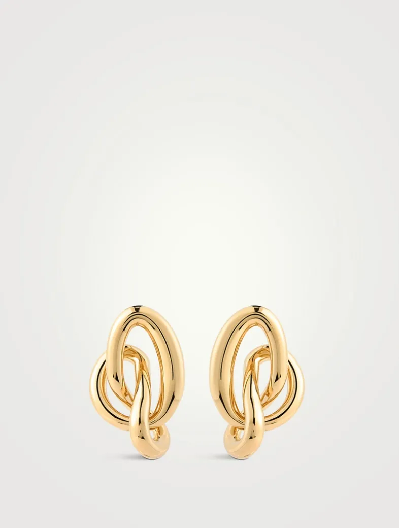 These gold earrings feature a delicate knot in a fluid, sculptural design that subtly references the interlocking Oscar ‘O’ emblem in an abstract way.