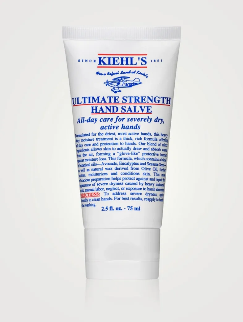 Formulated for the driest, most active hands, Kiehl’s Ultimate Strength Hand Salve is a heavy-duty moisture treatment with a thick, rich formula offering all-day care and protection. Kiehl’s blend of select ingredients allows skin to actually draw and absorb water from the air, forming a glove-like protective barrier against moisture loss. This formula, which contains a blend of botanical oils as well as natural wax derived from Olive Oil, further soothes, moisturizes and conditions skin. This most effective preparation helps protect against and repair the appearance of severe dryness caused by heavy industrial work, manual labour, neglect or exposure to harsh elements.