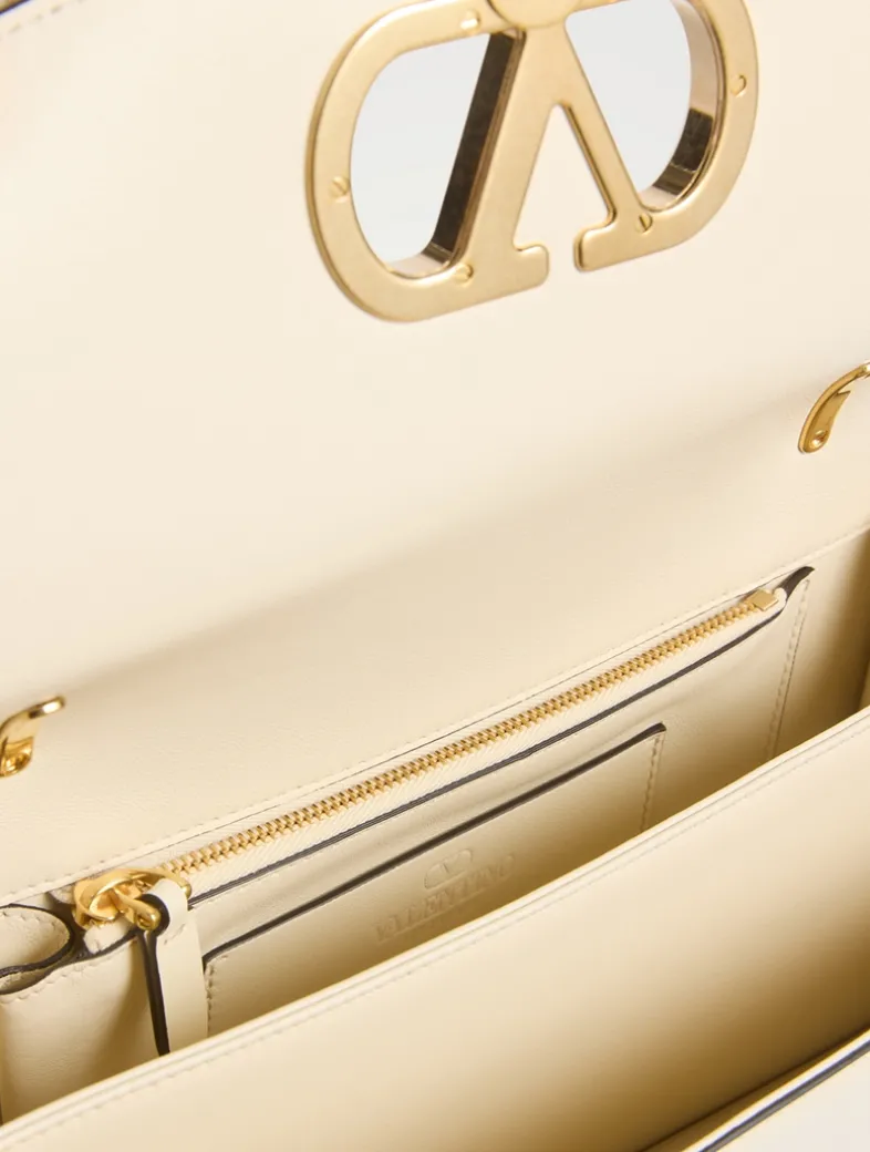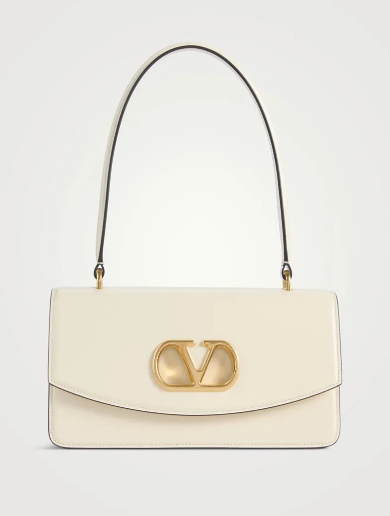 This structured leather bag has a leather lining with multiple pockets. It can be carried by hand or worn over the shoulder and is finished with signature logo hardware at the flap.