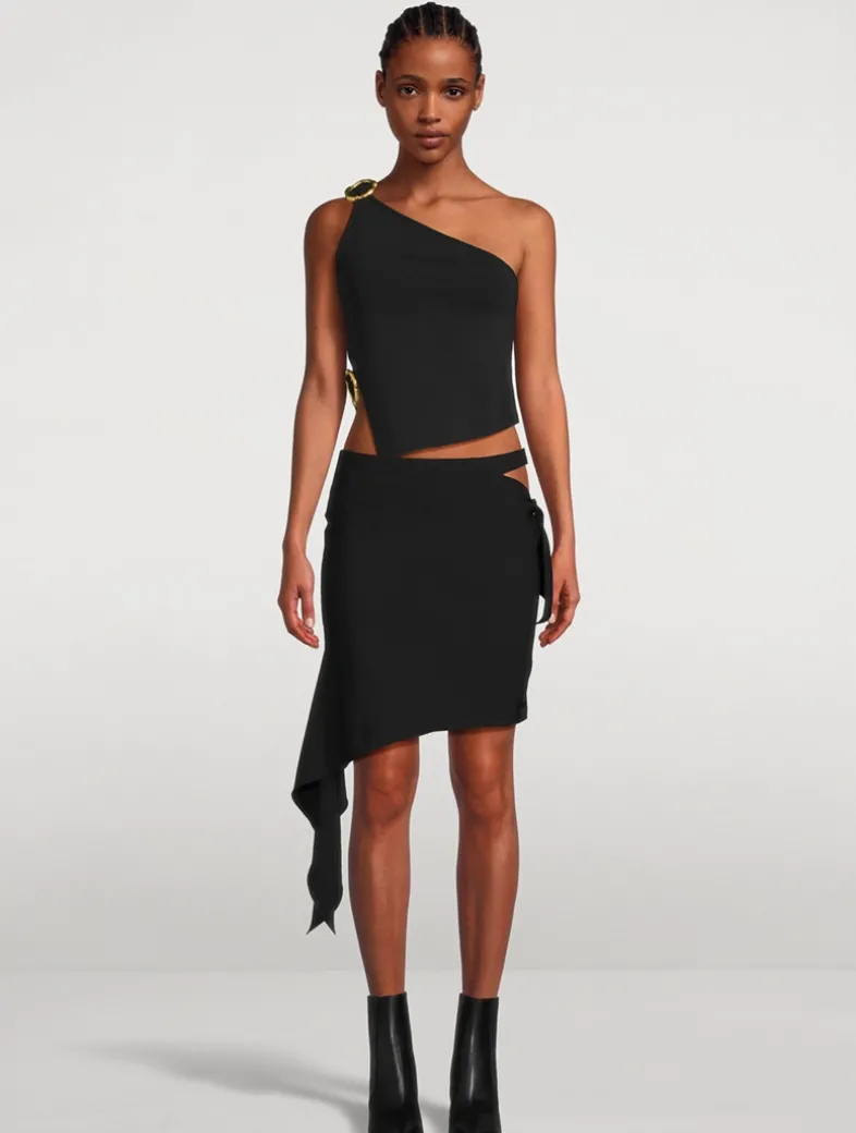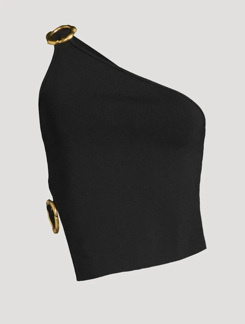 This asymmetrical knit top is embellished with abstract gold-toned buckle details at the shoulder and waist. It has a one-shoulder design and flattering side cut-out.