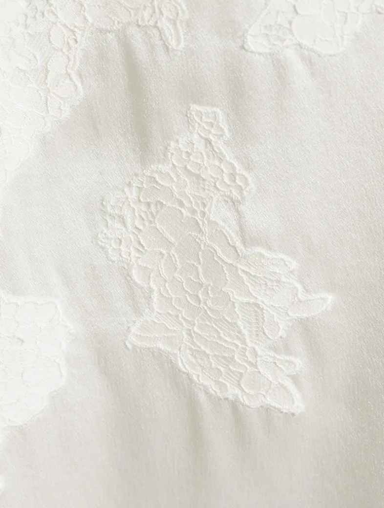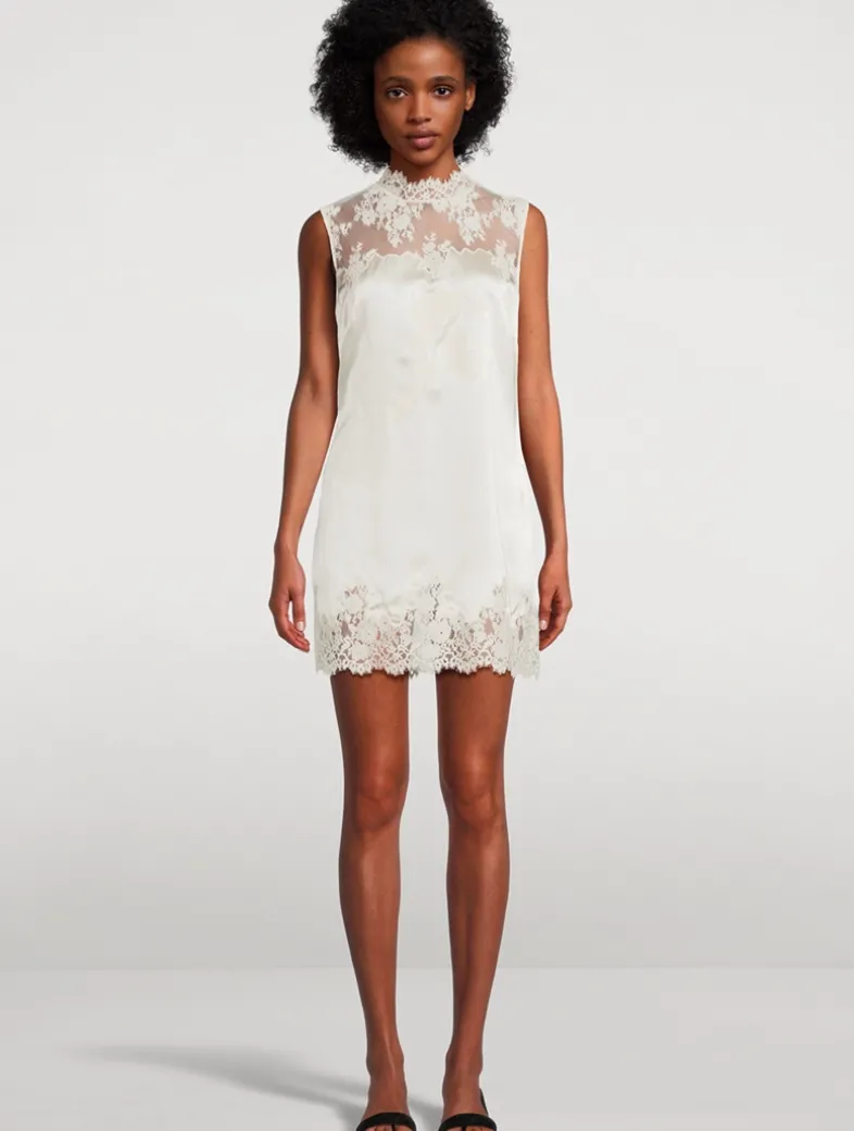 In a buttery silk satin, the Valeria Dress is a ‘90s-inspired sleeveless shift dress. It features a straight cut, a high neckline, and a playful mini-length hemline. Intricate floral lace adorns the neckline, bodice, and hem. Four self-covered buttons fasten at the back of the neck.