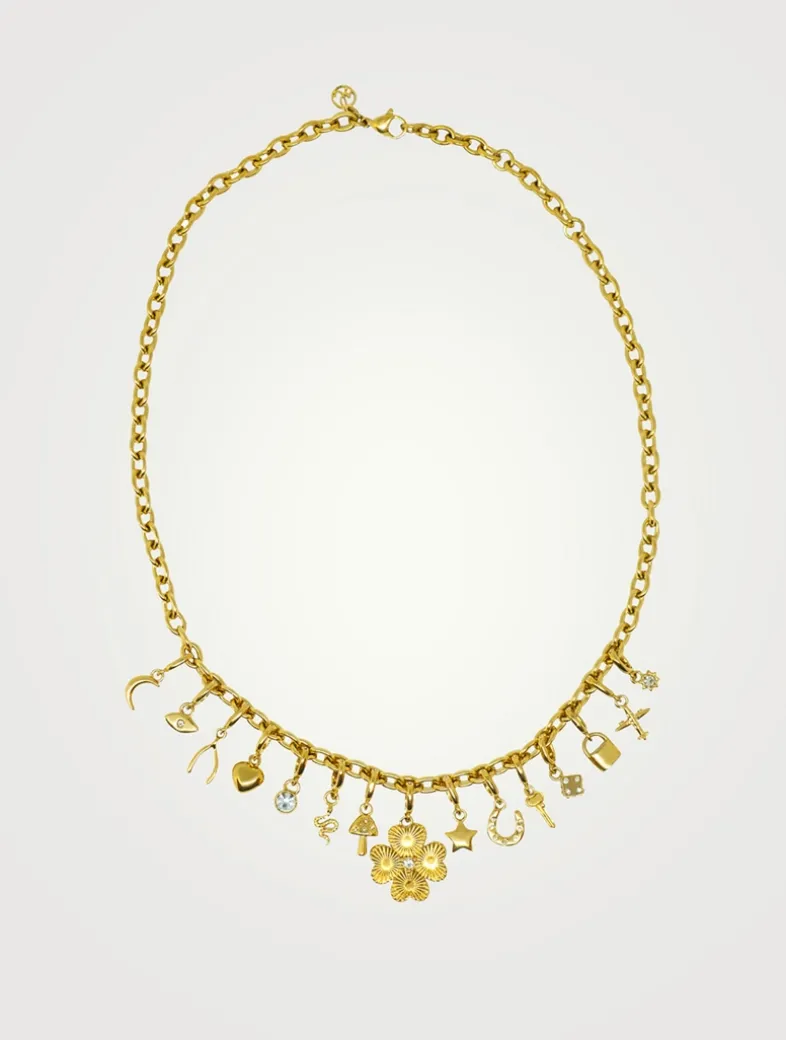 This golden statement piece features a mix of lucky symbols and dainty charms. From four-leaf clovers to horseshoes, wishbones, and sparkling crystals, every charm is thoughtfully designed to bring good fortune and positive energy your way. Each charm is equipped with a special clasp that allows you to easily remove and arrange them on the chain, so you can switch up the look as often as you choose. Free of lead, nickel and cadmium.