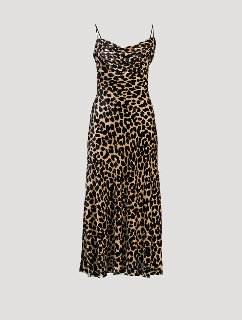 This slinky slip dress is crafted from soft velvet adorned with a bold leopard print. It has a mid-calf length and slim straps framing a draped cowl neckline.