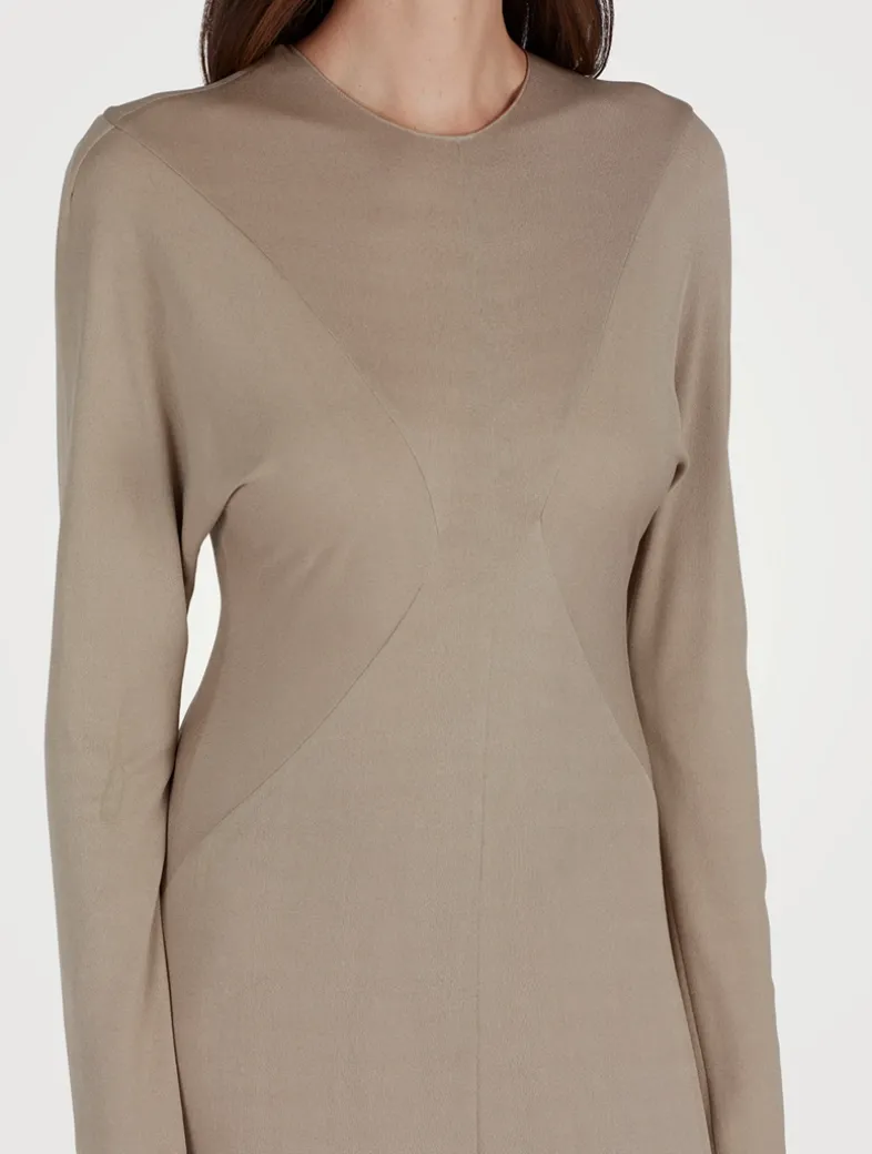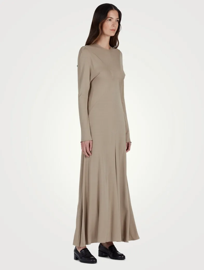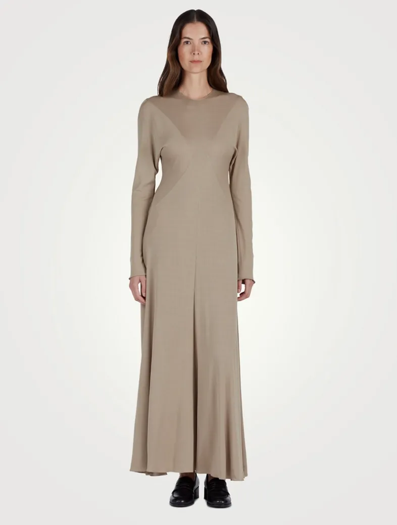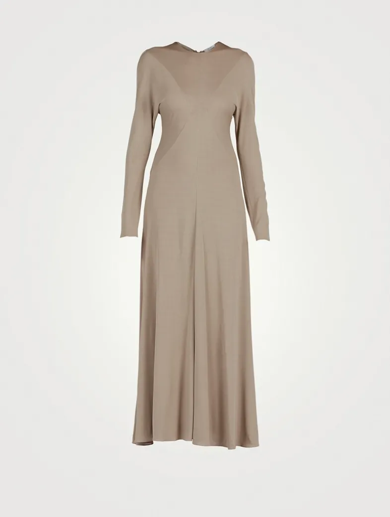 Embellished with tonal silk trims, this long-sleeve maxi dress is detailed with a roundneck, hidden back zip fastening, and flowy A-line skirt. Finished in a slim-fitting silhouette.