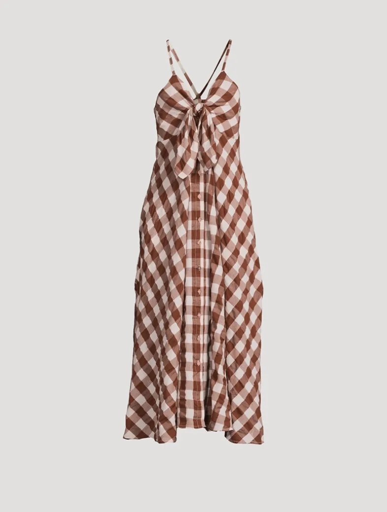 This effortless midi dress is featured in a classic checked print with a defined bowtie at the neckline and button-front closure for multiple ways to wear. Crafted from soft cotton, it has a V-neckline, side pockets, and adjustable straps that tie at the back.