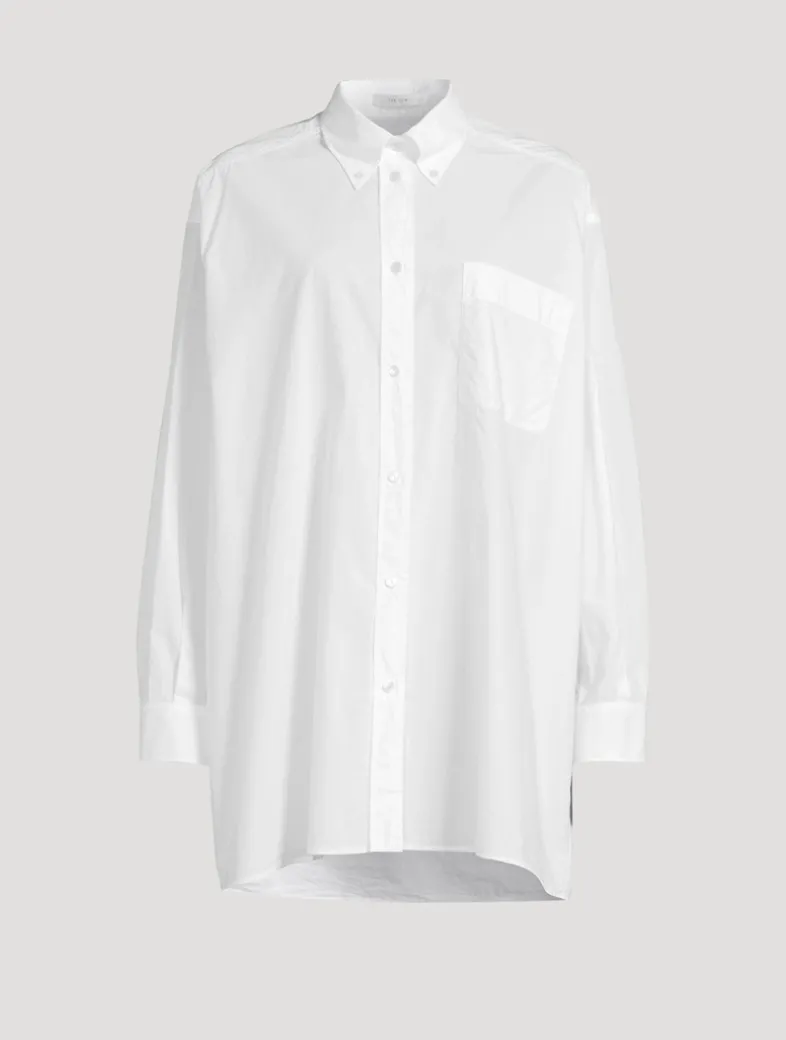 This long-sleeve shirt is detailed with buttoned point collar, and dropped shoulders. Crafted in a washed cotton poplin, this oversized-fit shirt is finished with a front patch pocket, buttoned cuffs, and an exposed front button placket.