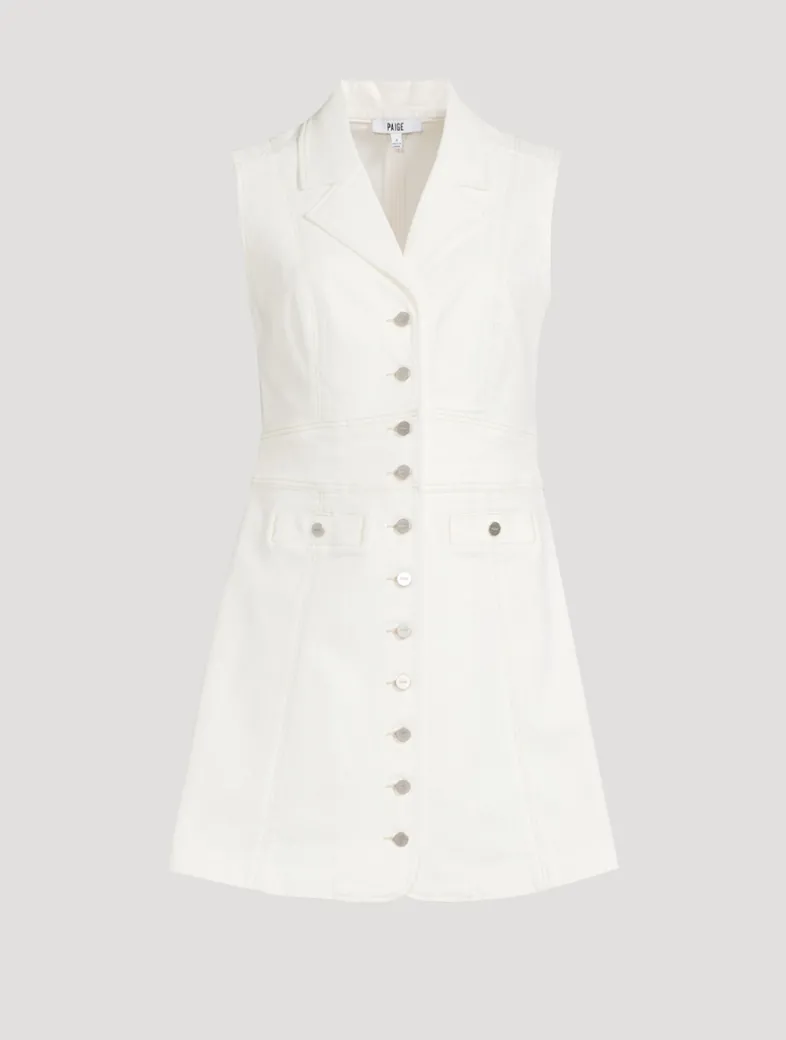 This sleeveless mini dress features a V-neckline framed by a lapel collar. Crafted from incredibly soft denim with a hint of stretch, this flattering dress is finished with buttoned welt pockets.