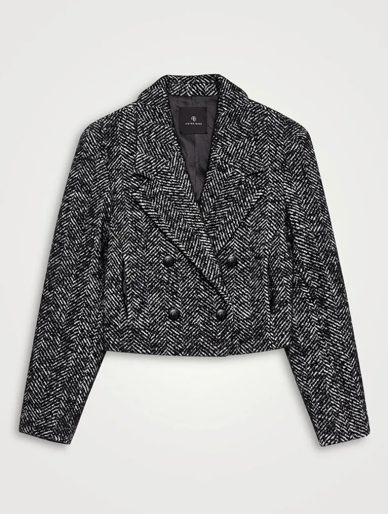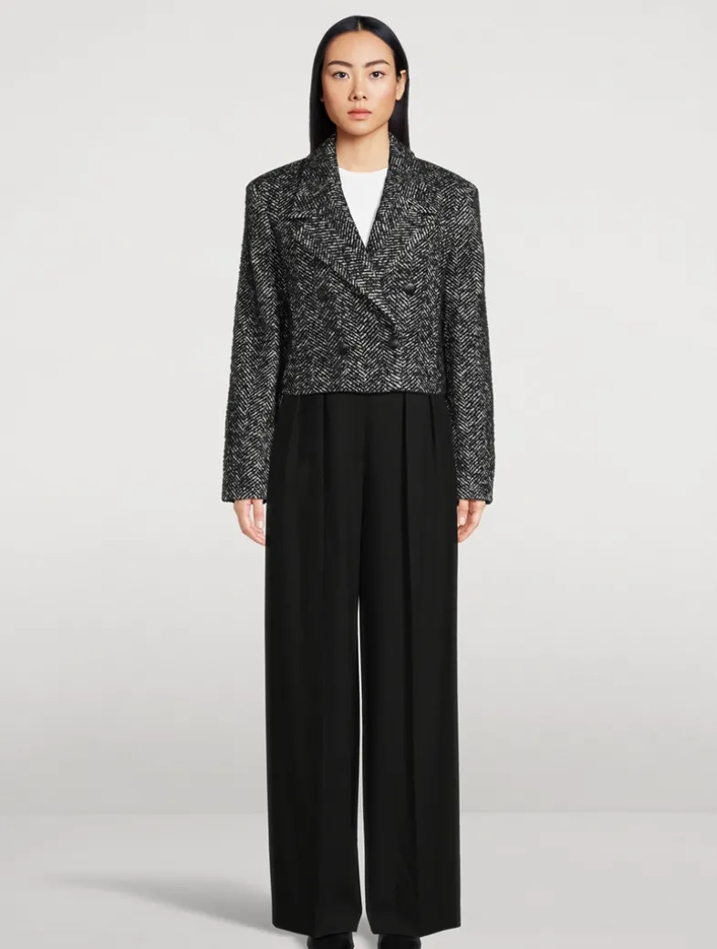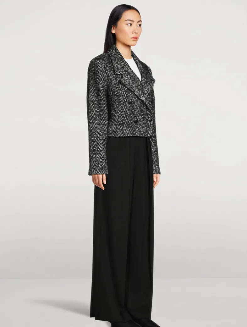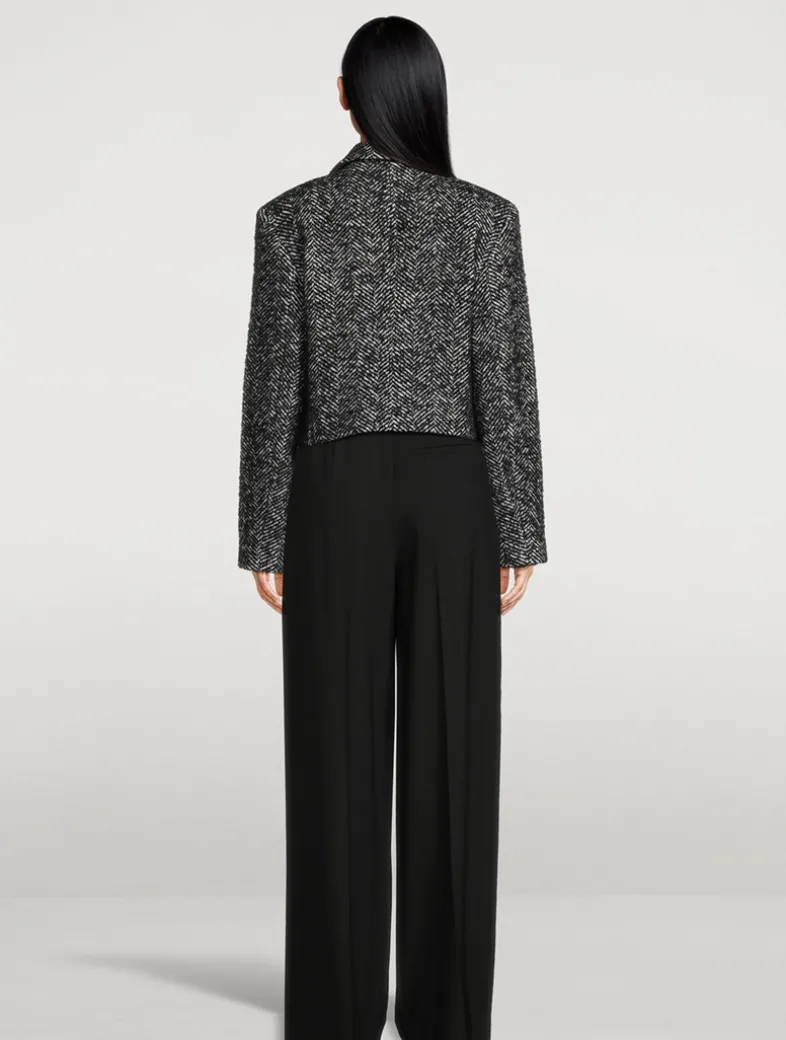 Structured with padded shoulders, this blazer in heavyweight, herringbone wool tweed, features a fashion cropped fit, notched collar, and double-breasted closure with four buttons. Two front pockets. Branded jacquard lining.