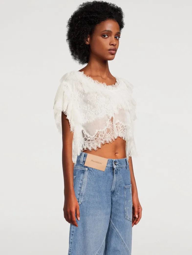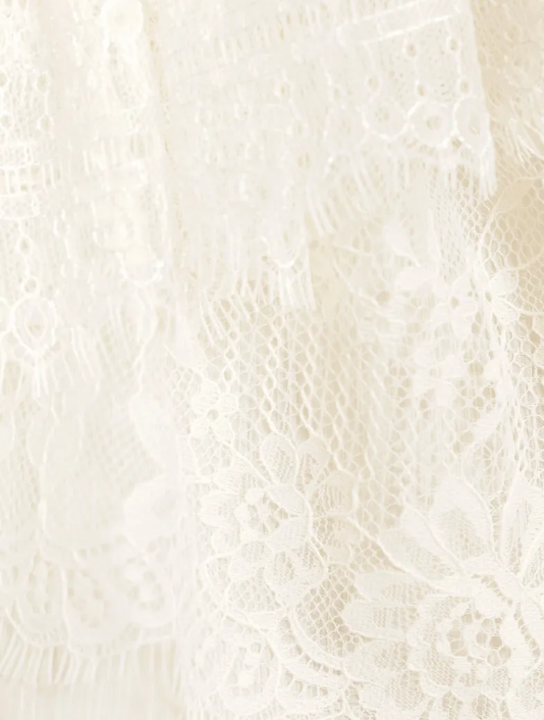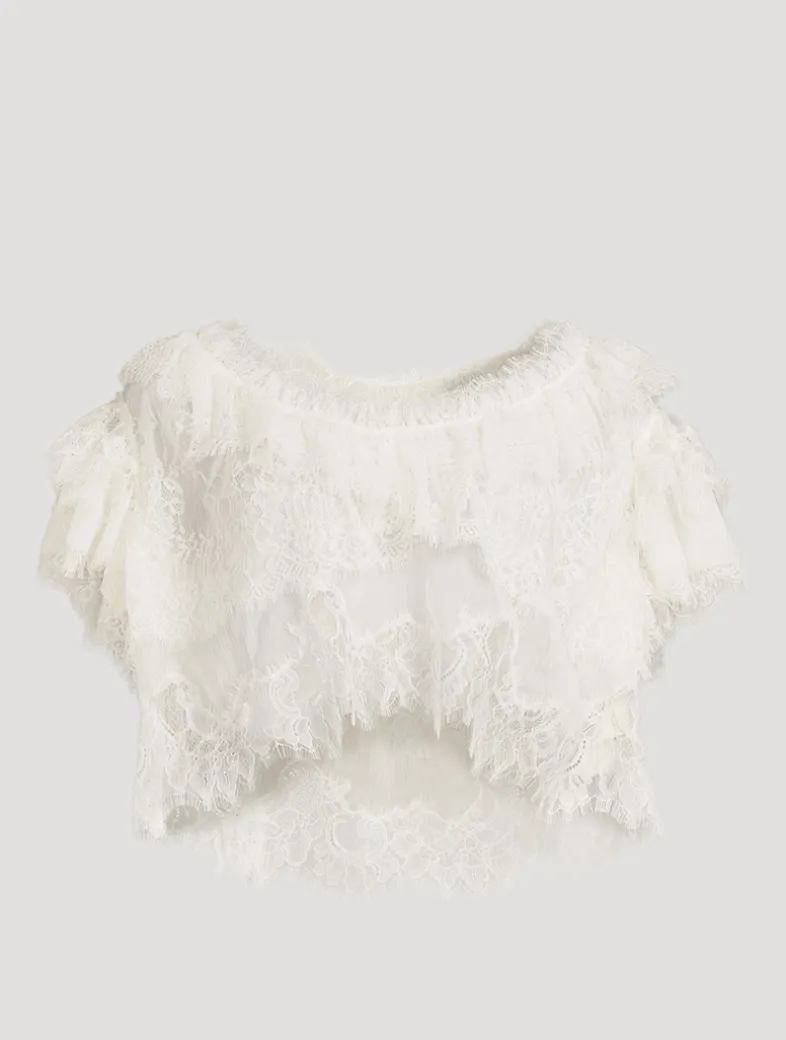 This stunning piece features a sheer, lace chiffon construction, giving this top a bohemian-inspired look. Adorned with ruffles and layers, the blouse has cap sleeves, an open scoop neck, and hits just below the natural waist.