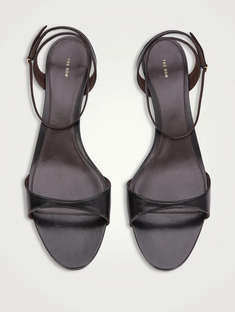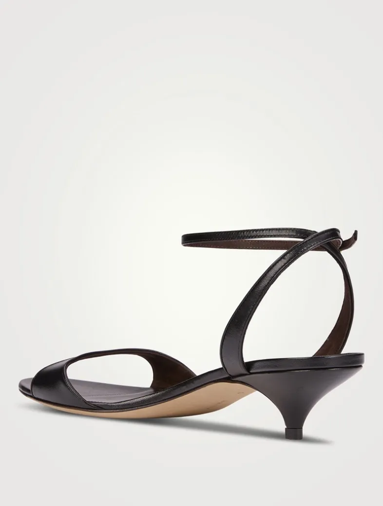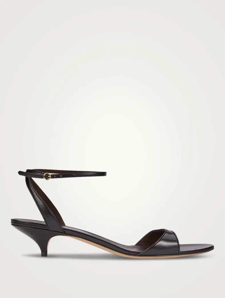 Made in Italy, these refined heeled sandal in soft lambskin leather are designed with a delicate buckled ankle strap and tapered kitten heel.