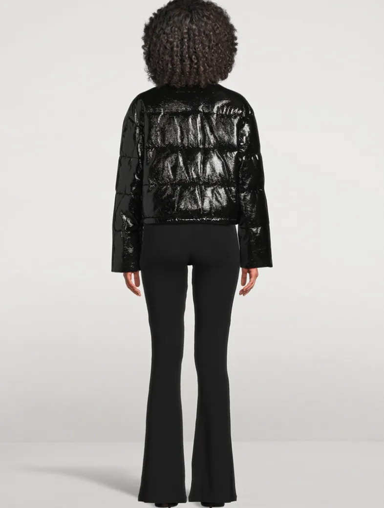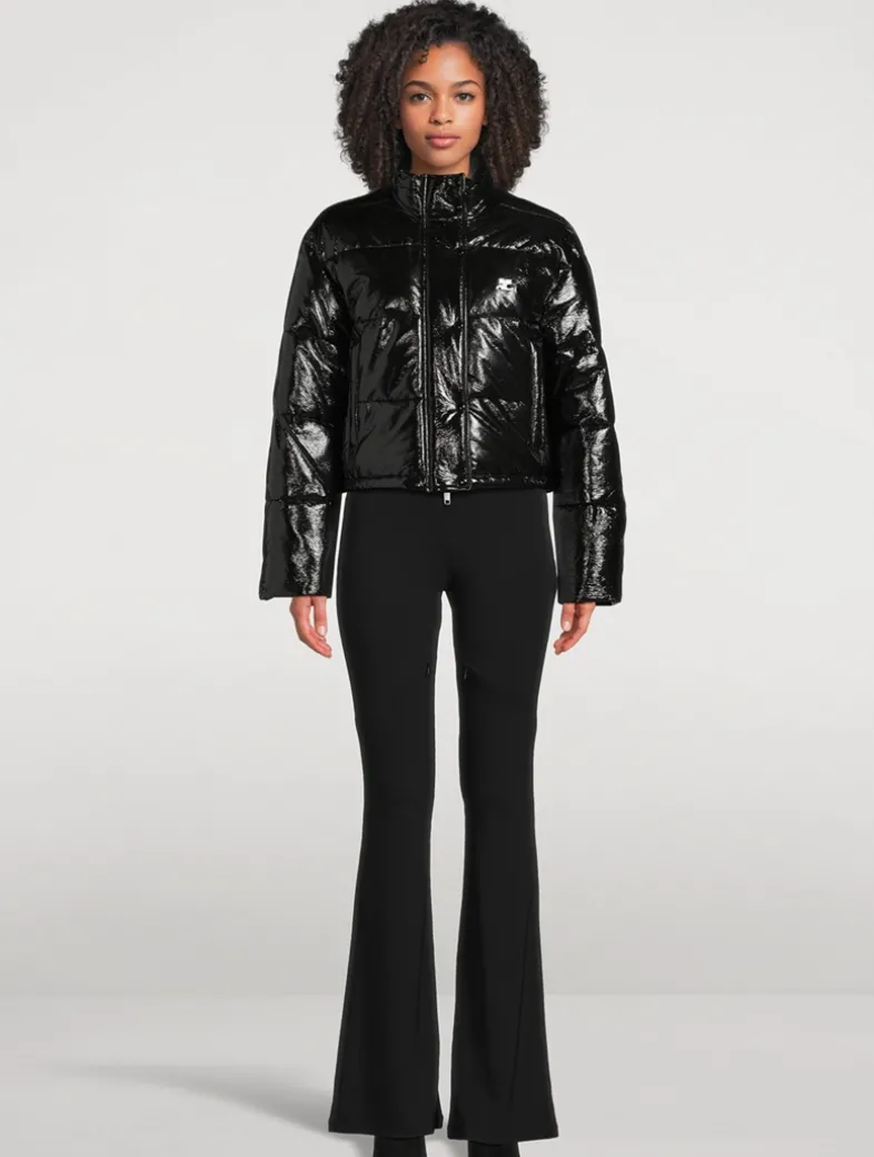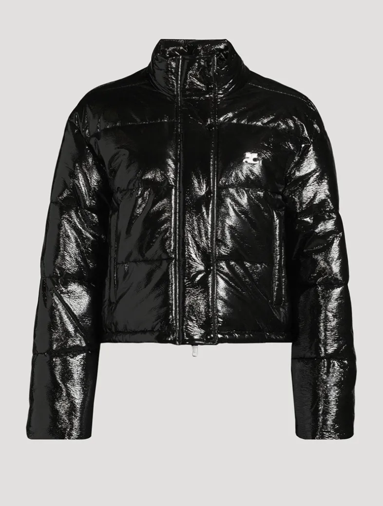 This cropped vinyl puffer jacket is designed with a stand-up collar, zipped side pockets, and long sleeves with integrated jersey mittens. Finished with embroidered AC logo on the chest and