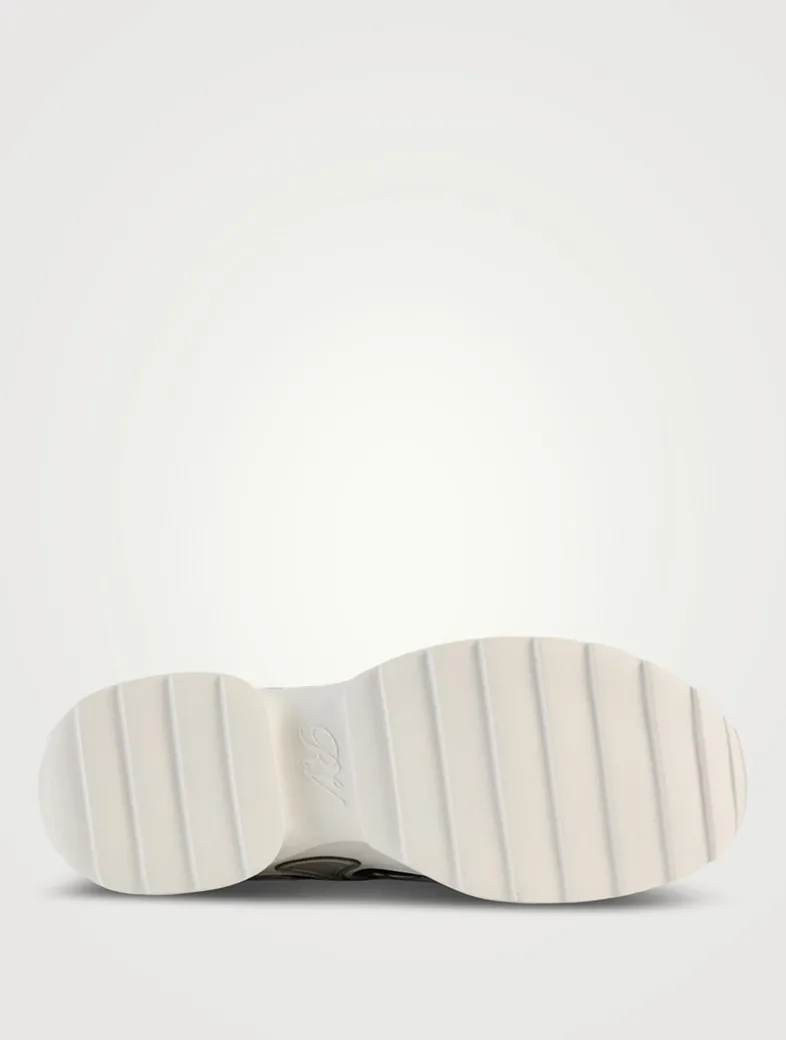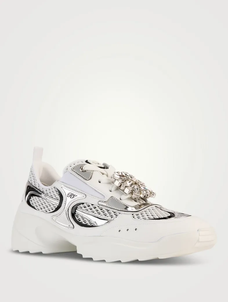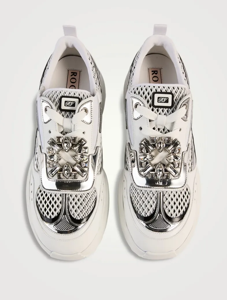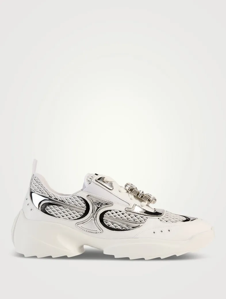 The Viv’ On The Run are sneakers with a serrated outer sole, adorned by a removable crystal buckle. This comfortable style, crafted in leather, mirror fabric, and mesh, adds a Vivier touch to a décontracté look.