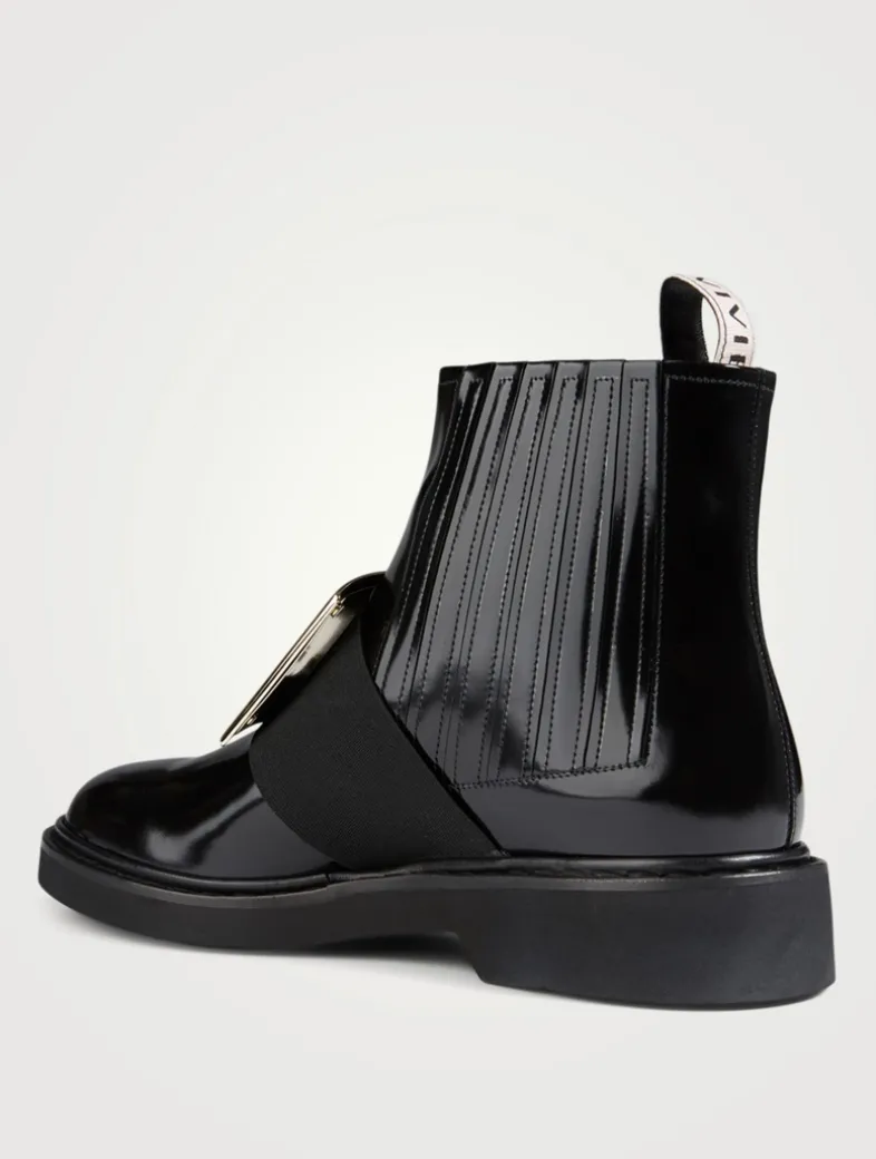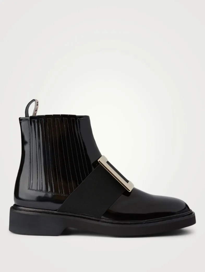 These flat ankle boots in a glossy patent leather feature an iconic metal buckle adorning a wide grosgrain ribbon. For ease of wear, the pair of boots features elasticated side panels and a ROGER VIVIER pull-tab at the back.