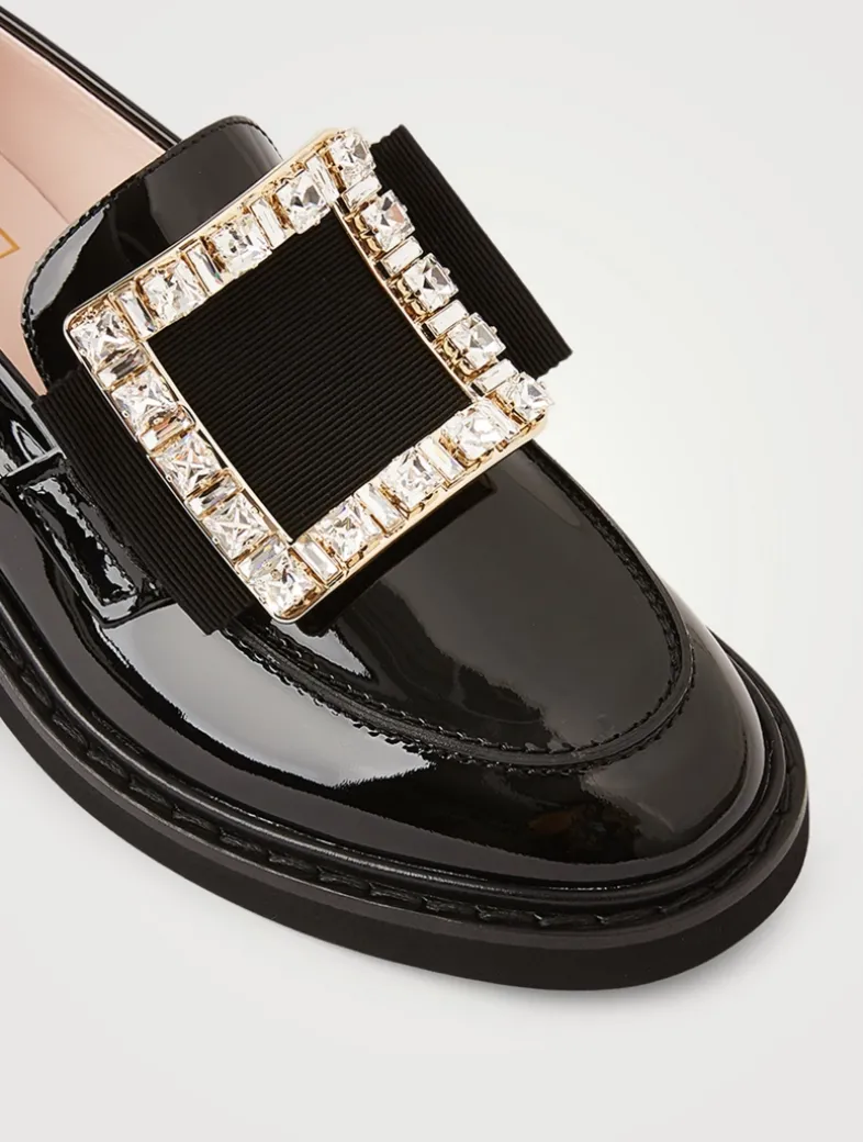 These masculine-inspired loafers are hand crafted in patent leather, and feature a front grosgrain panel, adorned by an iconic Swarovski crystal buckle for a feminine touch.
