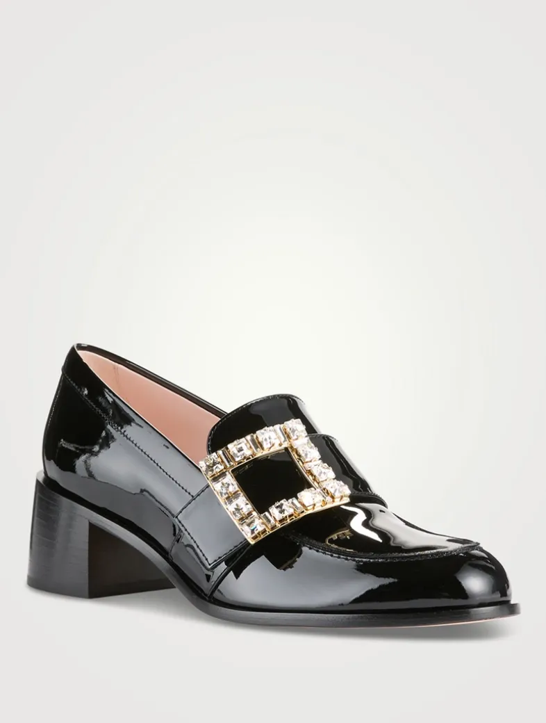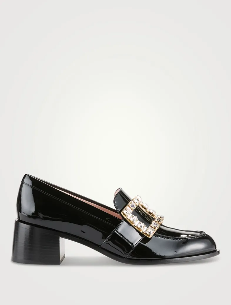 Timeless class and contemporary allure meet in these elegant patent leather loafers, handcrafted. Featuring a medium block heel and leather outsole, they are adorned with the iconic crystal buckle. A true office look must-have.
