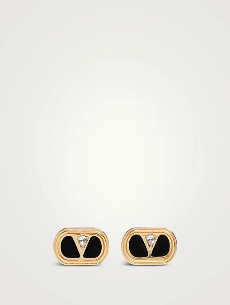 Elegant and modern, these stud earrings feature a gold-tone VLogo with a single crystal nestled within the ‘V’.