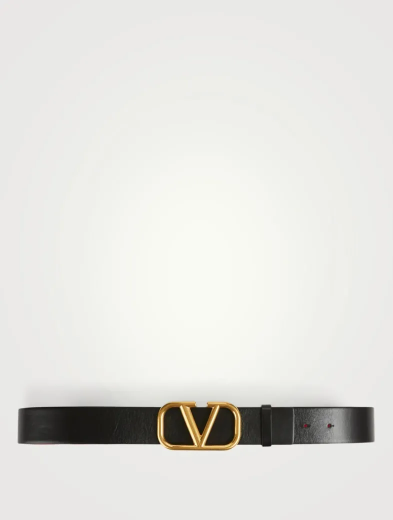 Fully reversible with two glossy leather sides, this Italian-crafted accessory displays a VLOGO signature buckle in an antique brass finish.