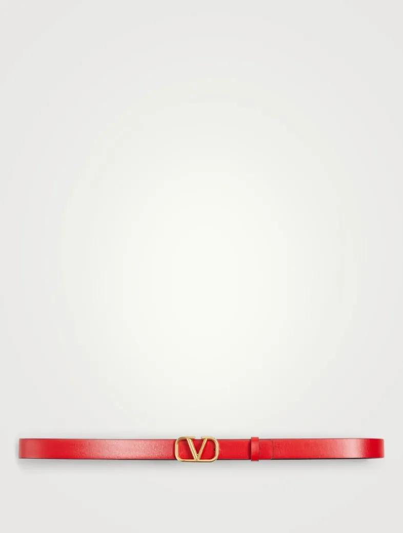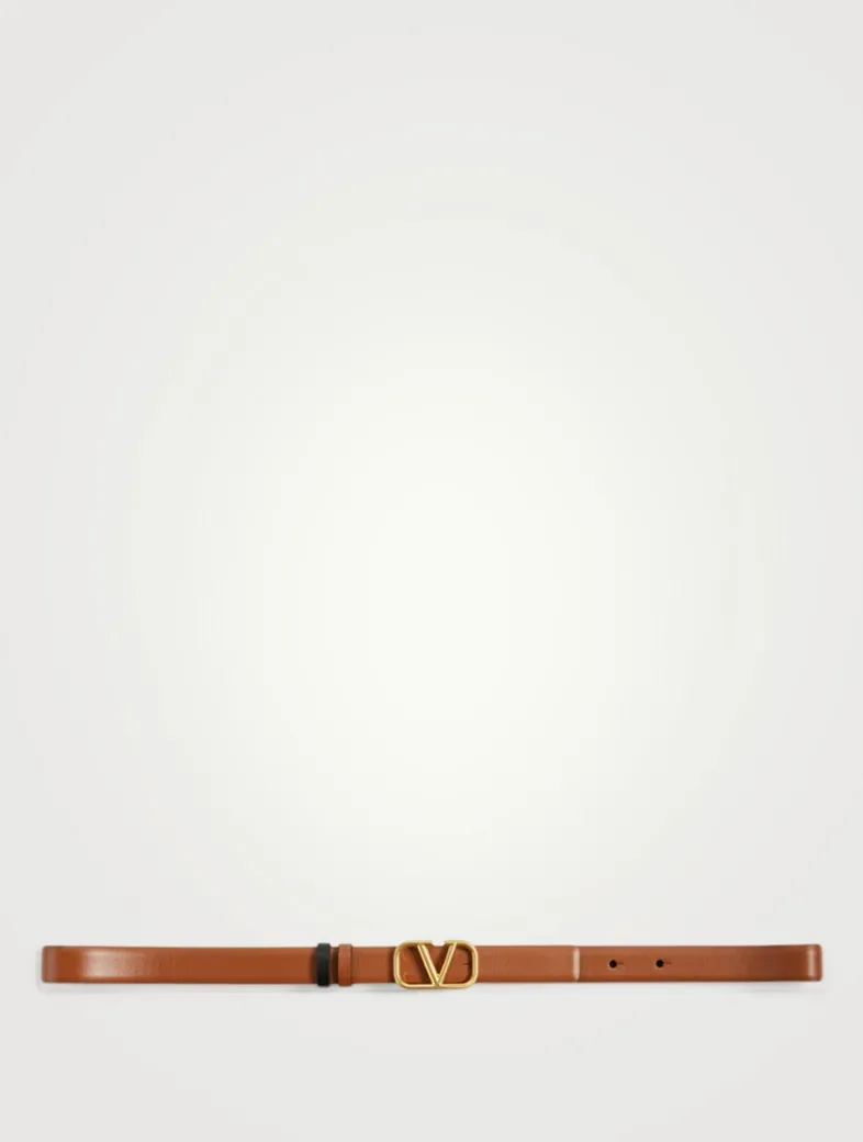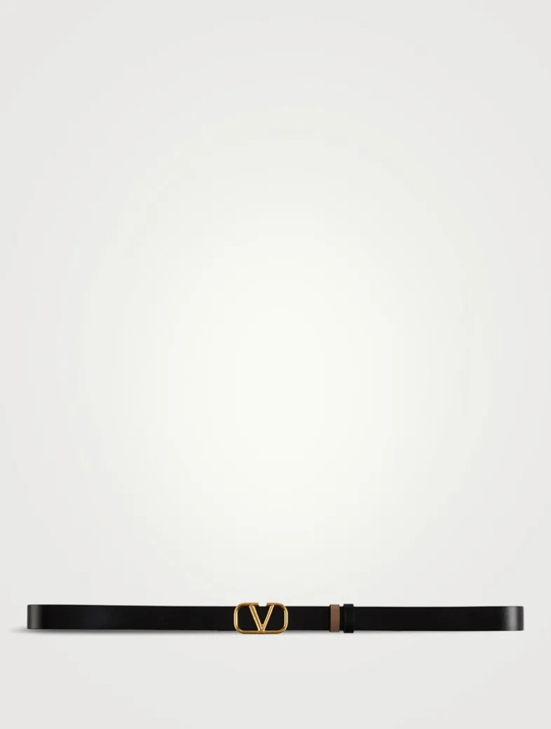 Fully reversible with two glossy leather sides, this Italian-crafted accessory displays a VLOGO signature buckle in an antique brass finish.