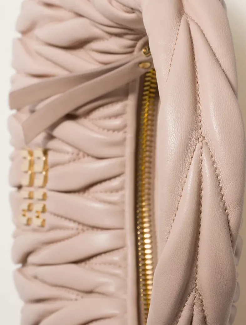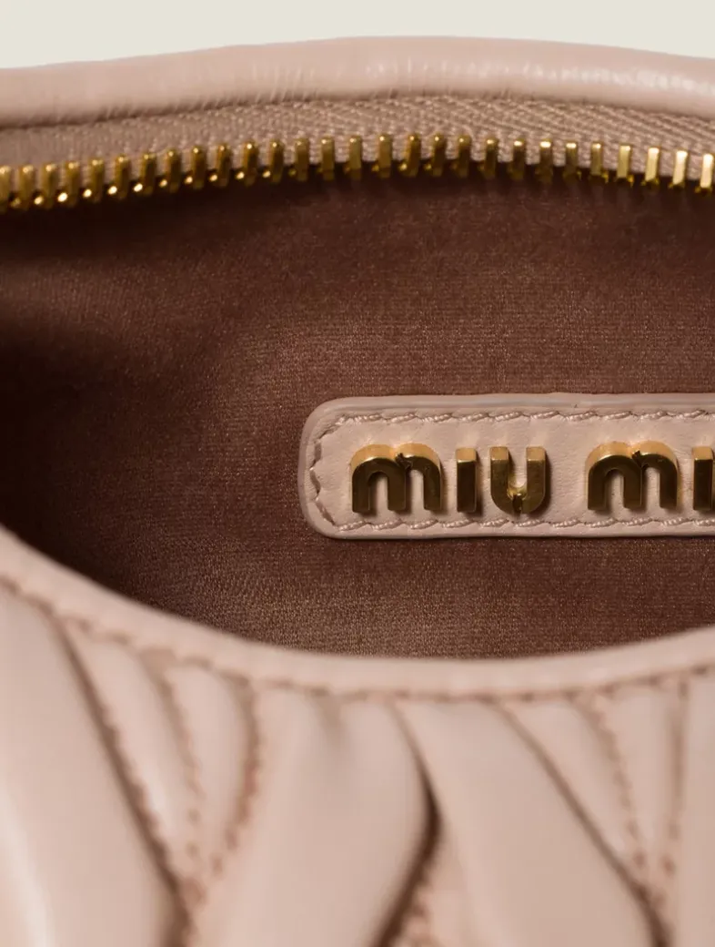 Matelassé motif ?Leather shoulder strap, length 110 cm ?Gold-tone hardware ?Metal lettering logo on the front ?Zipper closure ?Cotton satin lining ?This bag can hold a phone 16 cm x 7.8 cm x 0.76 cm in size ?The small Miu Miu wallet can be conveniently placed in this bag