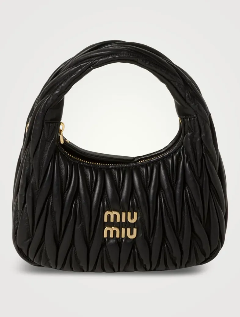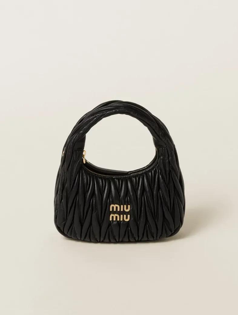 Matelassé motif Leather shoulder strap, length 110 cm Gold-tone hardware Metal lettering logo on the front Zipper closure Cotton satin lining This bag can hold a phone 16 cm x 7.8 cm x 0.76 cm in size The small Miu Miu wallet can be conveniently placed in this bag