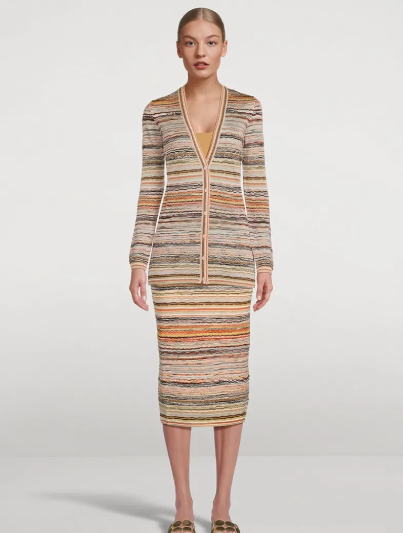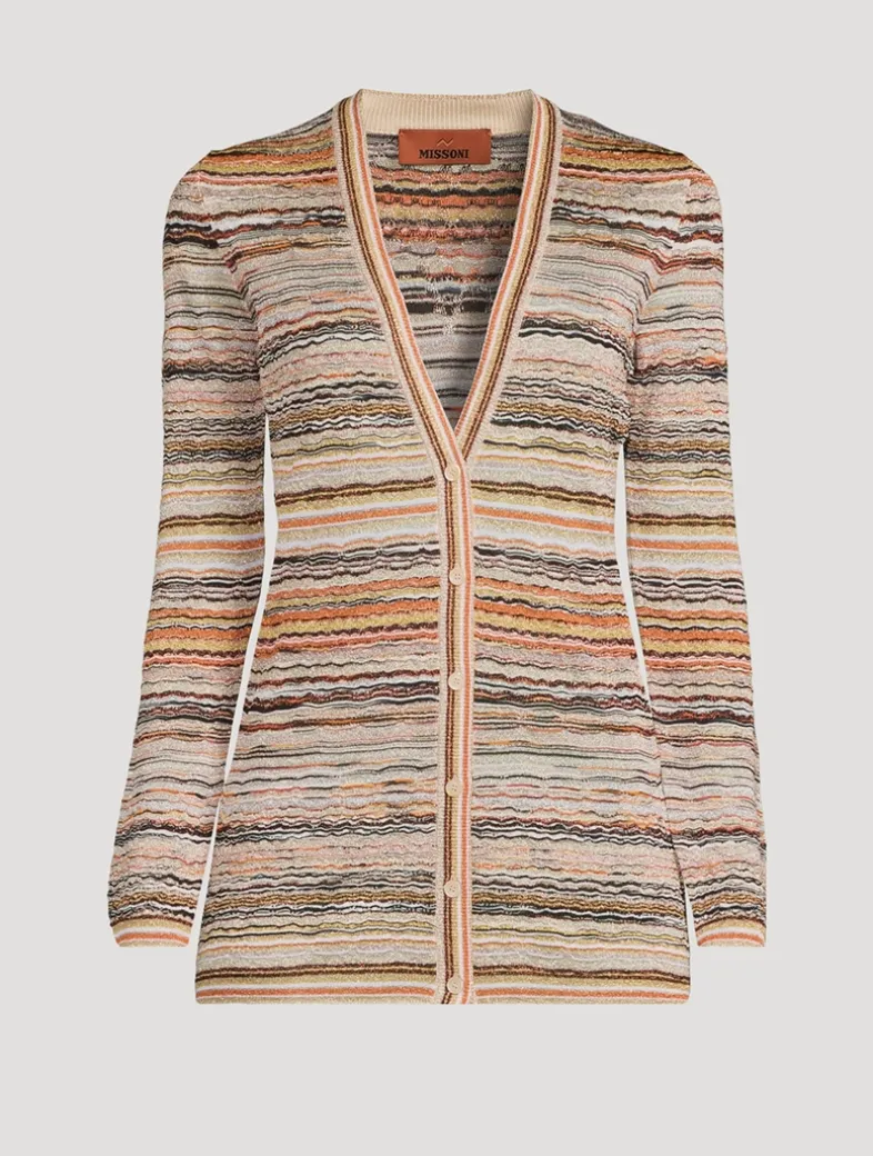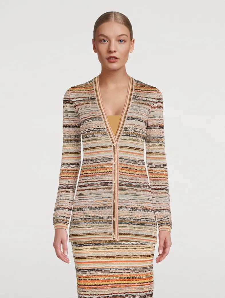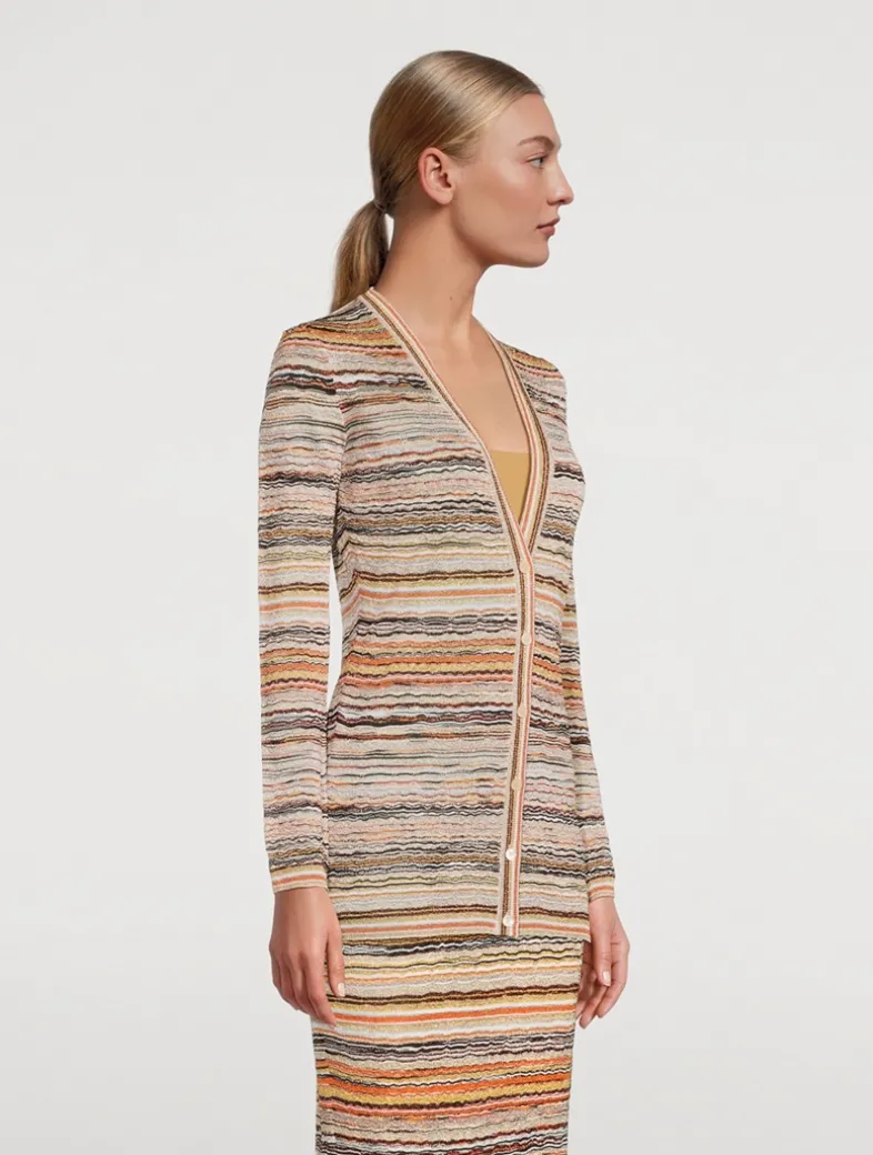 This cardi, created with the mastery of Missoni, stands out for its textured knit fabrication and the shimmering wave pattern, which is symbolic of the maison. Cut in a curve-hugging silhouette, it has a V-neckline, long sleeves, and buttoned closure.