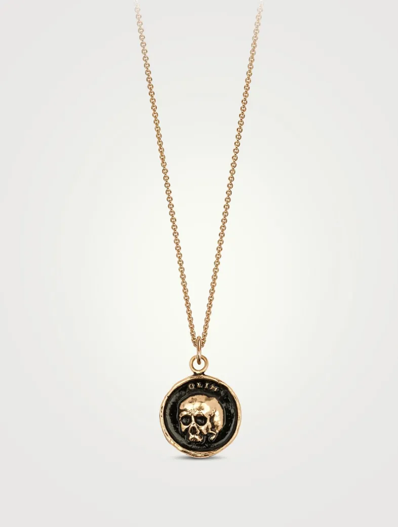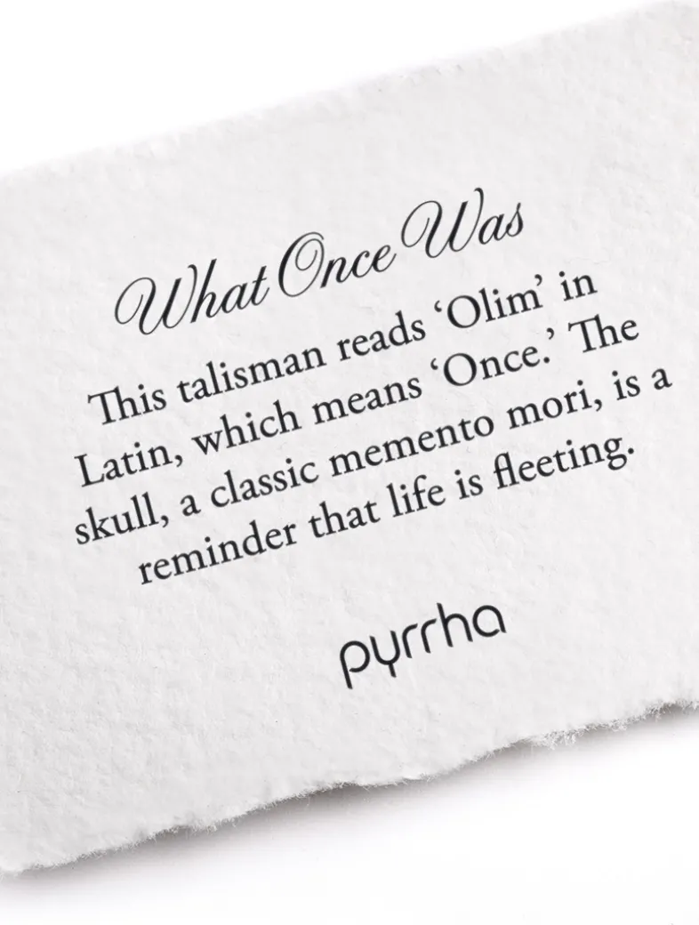Bearing the Latin inscription Olim, meaning “Once,” this talisman features a skull—a classic memento mori that calls us to embrace life’s impermanence. Cast in 100% recycled 14k gold and handcrafted in Vancouver, Canada.