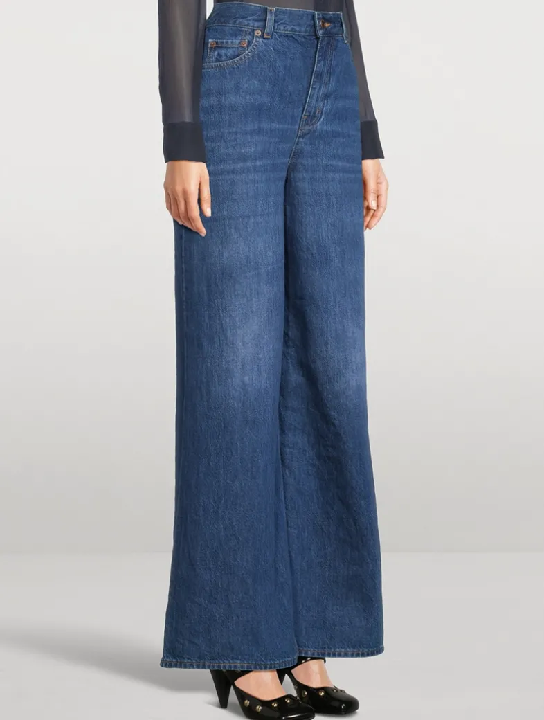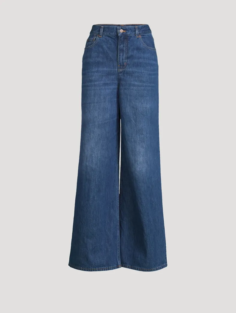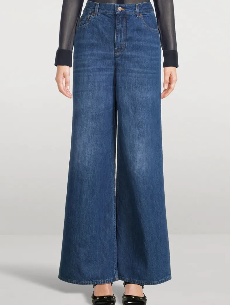 Cut to sit high on the waist, these five-pocket jeans have a dramatic wide-leg silhouette. They are crafted in Italy from 100% cotton denim.